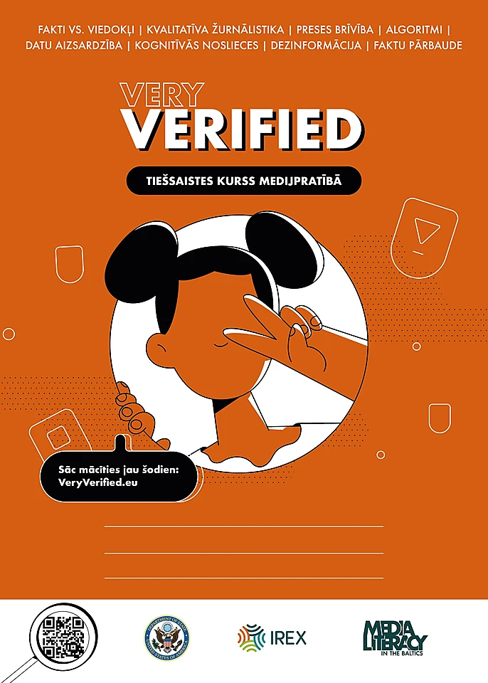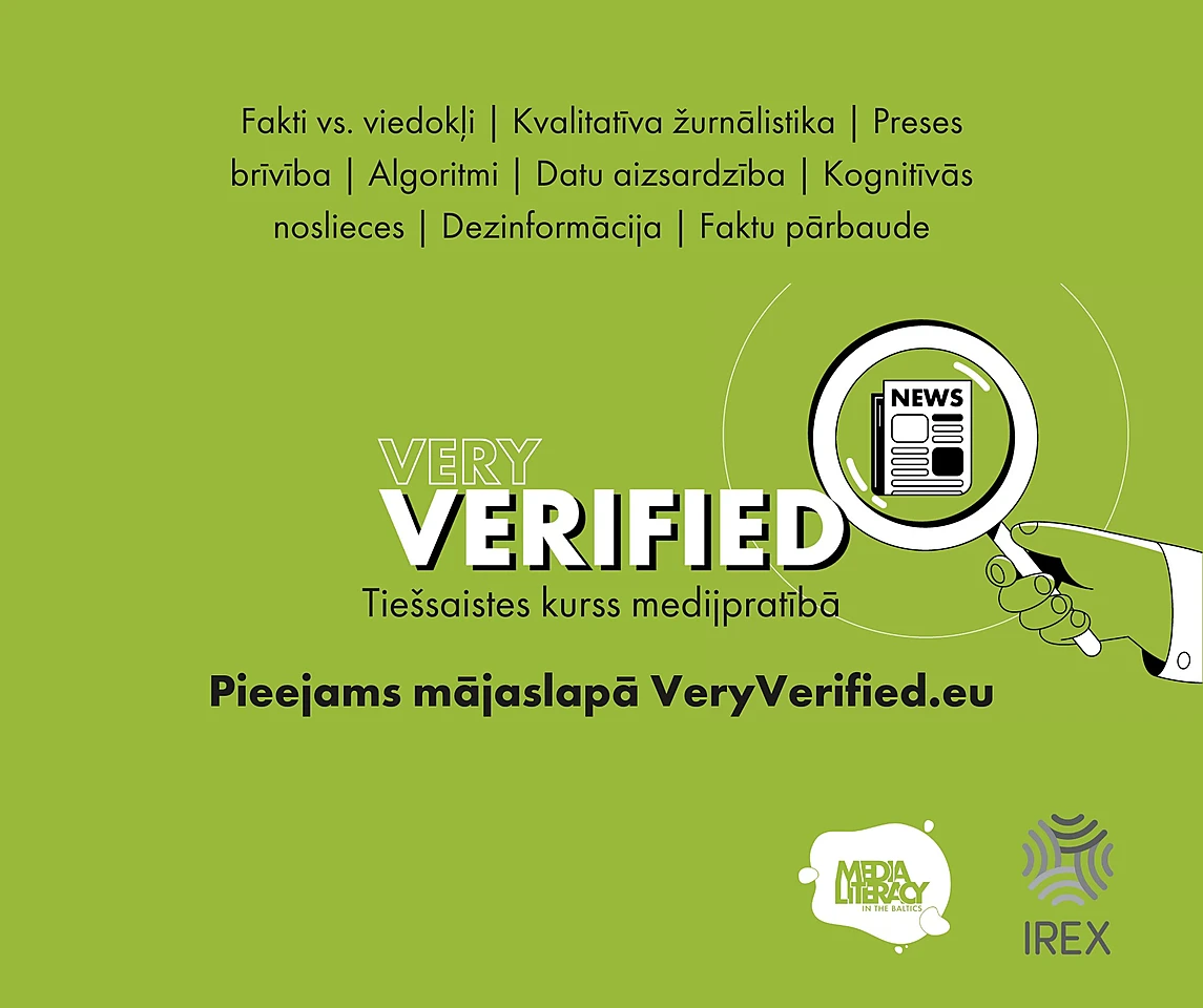 Rīga, 2022. gada 31. augusts. – Lai palīdzētu Baltijas valstu iedzīvotājiem stiprināt noturību pret dezinformāciju, atpazīt manipulāciju un kļūt par zinošākiem mediju patērētājiem, globālā attīstības un izglītības organizācija IREX ir izstrādājusi jaunu brīvpieejas tiešsaistes kursu medijpratībā. “Very Verified”, ko veidojusi IREX īstenotā ASV Valsts departamenta Baltijas Medijpratības programma, ir piecu nodaļu kurss par to, kā analizēt mediju vēstījumus un identificēt dezinformāciju, akcentējot kritisko domāšanu. Tas ir īpaši veidots Baltijas valstu auditorijai un pieejams piecās valodās: latviski, igauniski, lietuviski, krieviski un angliski. Uzsvars kursā likts uz prasmju attīstīšanu, proti, sniedzot ieteikumus kā patērēt informāciju, bet nenorādot uz to, kuru saturu tieši izvēlēties.