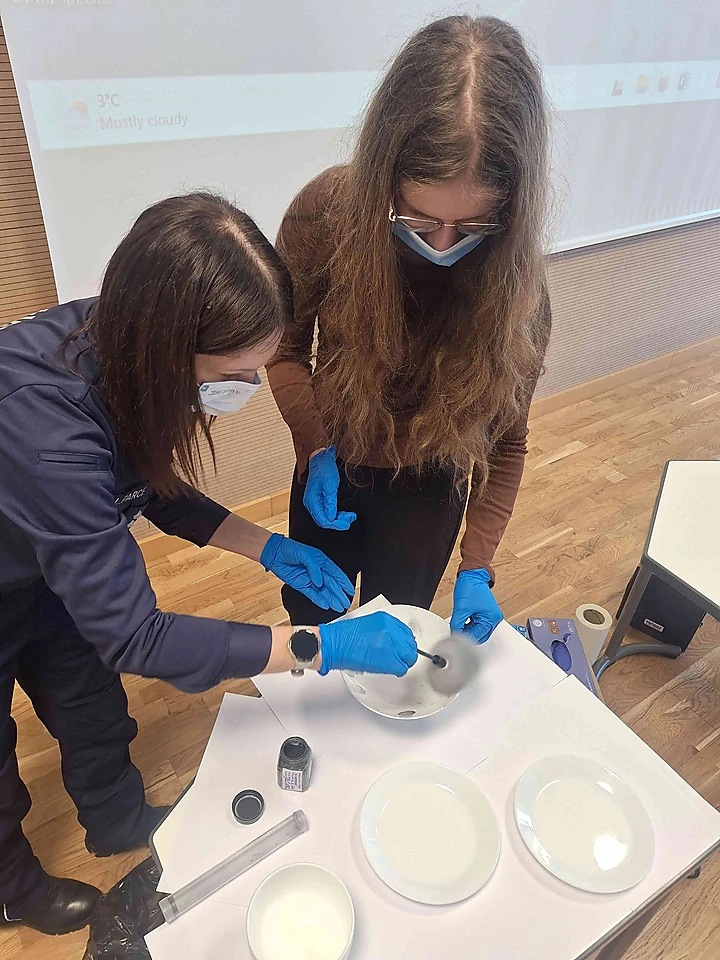 Valsts policijas Galvenās kriminālpolicijas pārvaldes Kriminālistikas pārvaldes Reģionu biroja Zemgales nodaļas vecākais eksperts Eduards Manavickis un vecākā inspektore krimināliste Lauma Parce ļāva skolēniem iejusties kriminālista lomā. Jaunieši uzzināja, ar kādu tehniku un materiāliem strādā šīs profesijas pārstāvji, kā tiek meklēti un izņemti pirkstu un apavu nospiedumi, kā arī paši varēja izgatavot savus pirkstu nospiedumus.