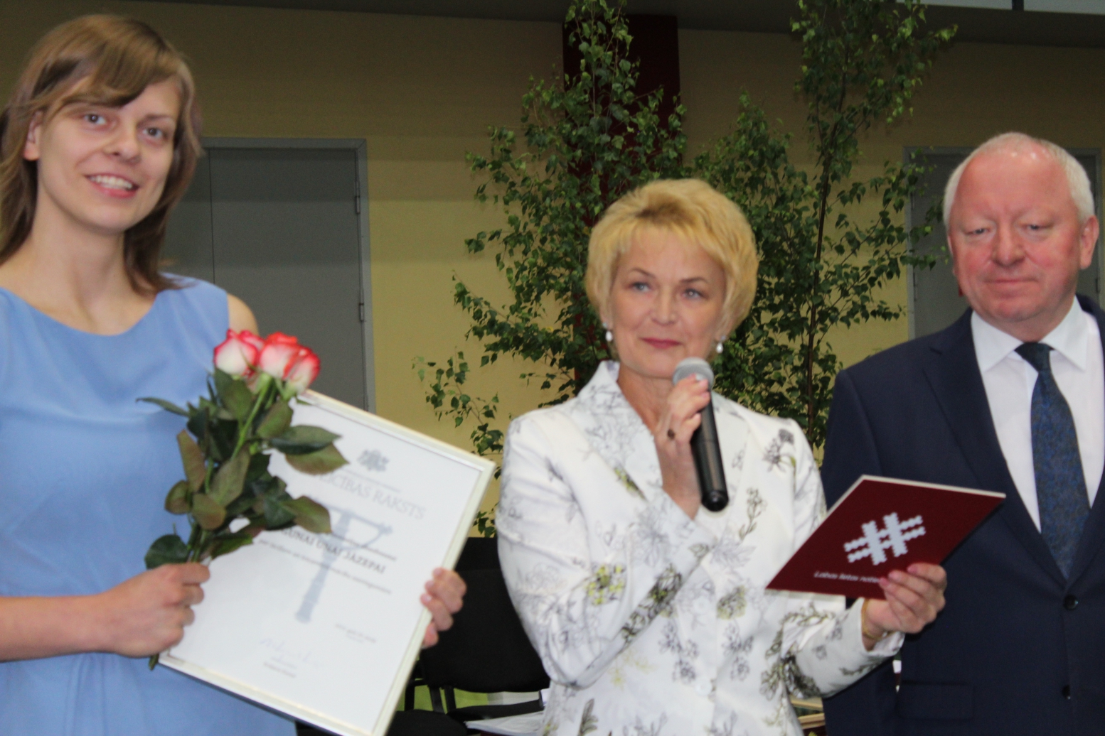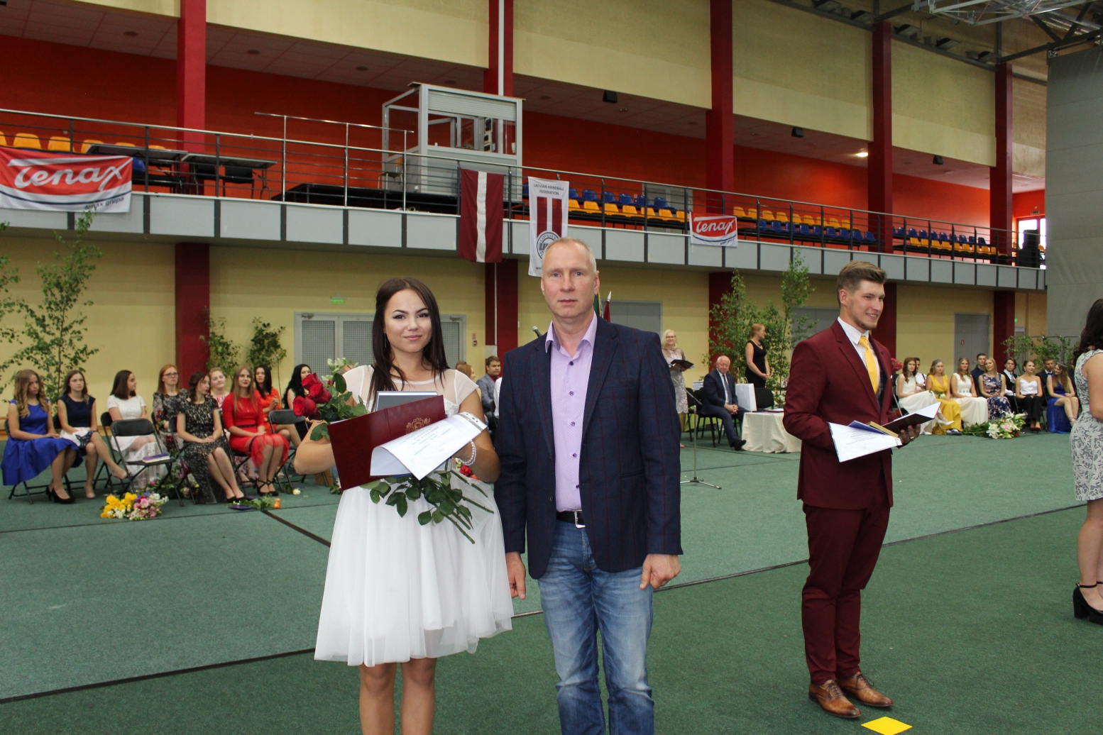 Domes priekšsēdētājs pateicās skolotājiem un vecākiem par atbalstu jauniešiem viņu izaugsmē. Tika pasniegti vairāki apbalvojumi. Par izciliem un teicamiem mācību sasniegumiem (sekmju vērtējumi - tikai 9 un 10 balles) ar LR Ministru Kabineta Pateicības rakstu apbalvota absolvente Guna Una Jāzepa. Kā ģimnāzijas visizcilākajai absolventei viņai tika pasniegta arī Izglītības un zinātnes ministrijas un Finanšu ministrijas pateicība 100-gades izcilniekam 500 eiro apmērā un ģimnāzijas Sudraba Pūce, kas katru gadu izlaidumā tiek piešķirta par ieguldījumu skolas dzīvē un personīgajiem sasniegumiem. Guna Una to saņēma gan par mācību sasniegumiem, gan atsaucību skolas norisēs. - Par visu to, kādu mēs vēlamies redzēt katru jaunieti, - apsveicot Gunu Unu, sacīja direktore. Par visaugstāko vidējo mācību gada vērtējumu Gunas Unas Jāzepas vārds tiks novietots ģimnāzijas Goda sienā.