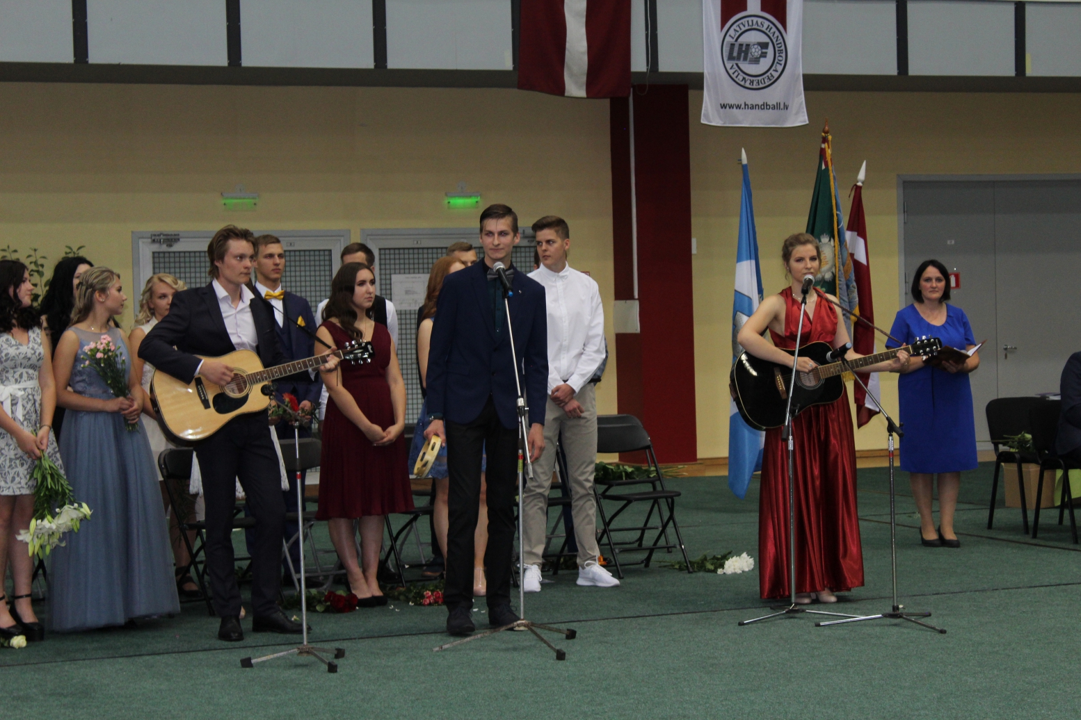 Sarīkojuma noslēgumā absolventi Rēzija Granta, Jānis Tomass Preiss un Guna Una Jāzepa svinīgi nodeva 11. klašu skolēniem ģimnāzijas karogu. Izskanēja kopīgi dziedāta skolas himna.