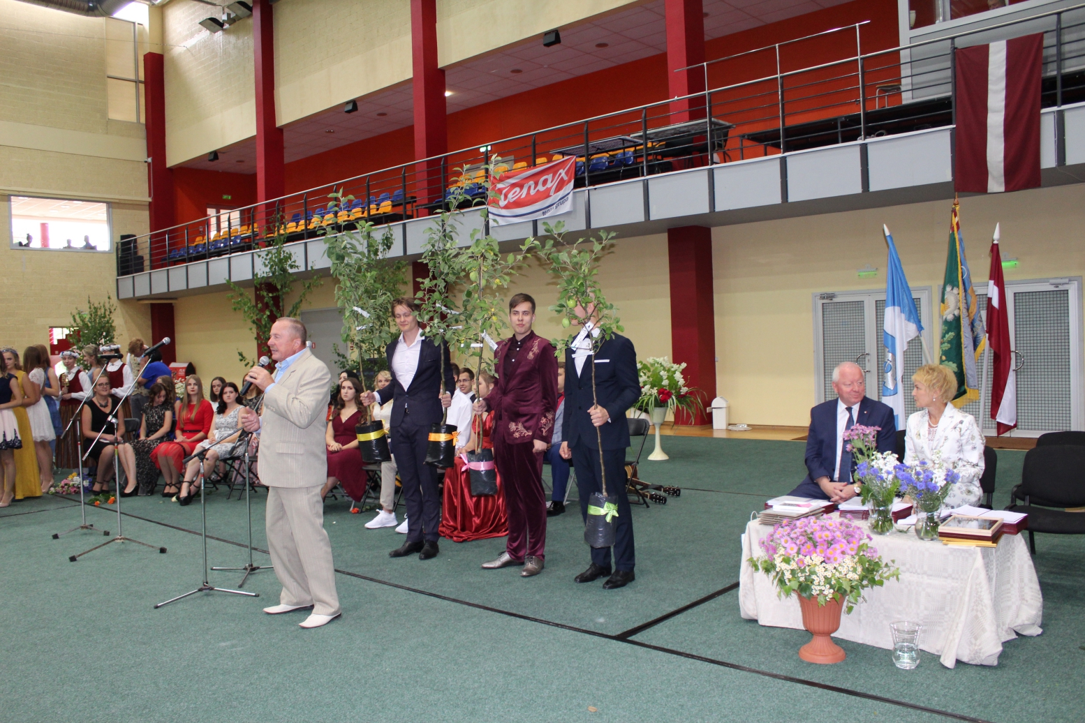 Vecāku vārdā Augusts Mešķis sacīja paldies ģimnāzijas pedagogiem un vadībai par darbu un pūlēm, lai šodien varētu priecāties par absolventiem. Savukārt arī absolventu vārdā Augusts Mešķis pasniedza skolai dāvanu - četras ābelītes, kuras turpmākos gadus priecēs ar skaistiem ziediem pavasaros un dāsnu ražu rudeņos.