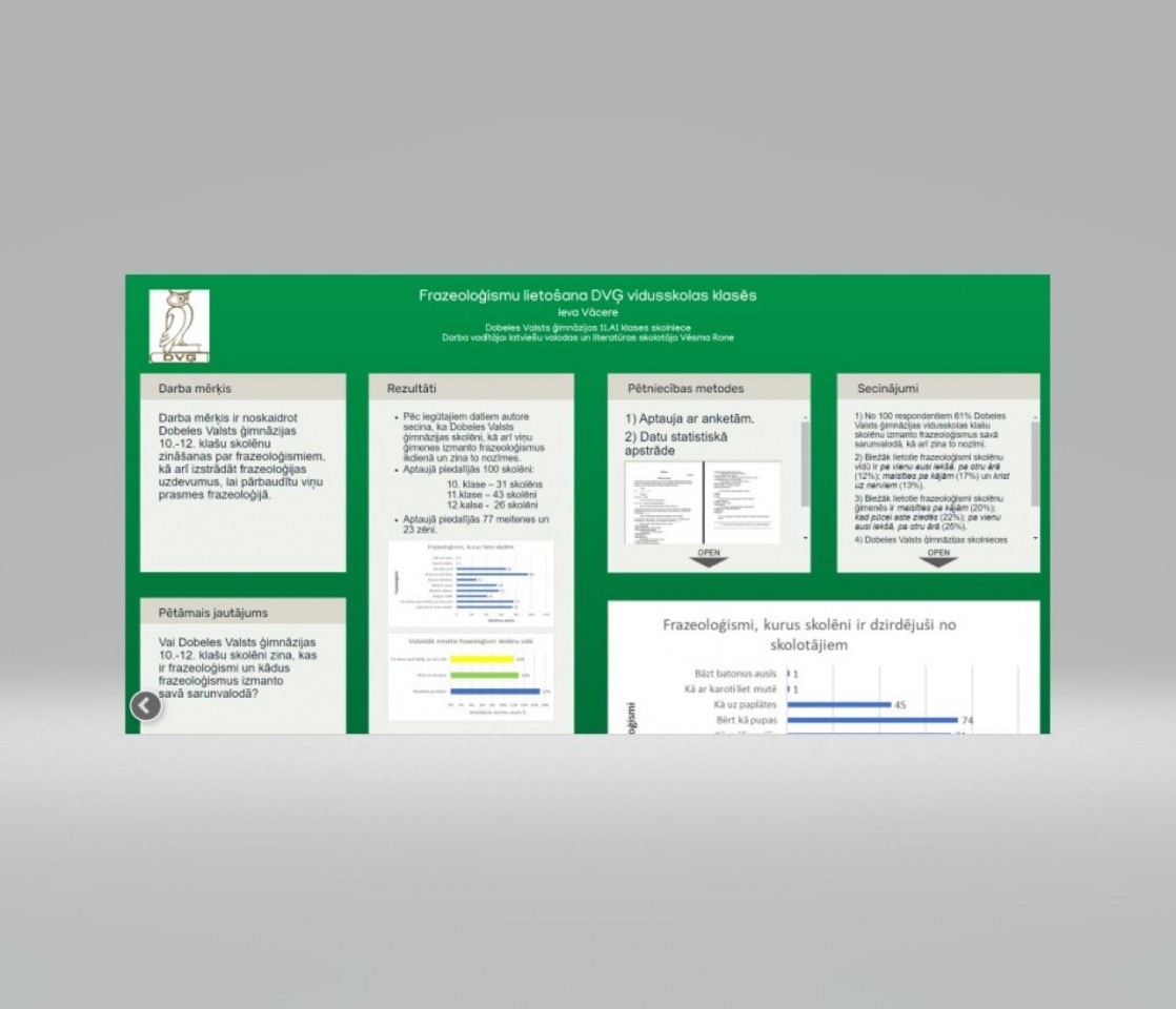 Atzinību guvušo skolēnu vidū ir arī Dobeles Valsts ģimnāzijas 11.A1 klases skolniece Ieva Vācere, kura skolotājas Vēsmas Rones vadībā izstrādāja darbu “Frazeoloģismu lietošana DVĢ vidusskolas klasēs”. Darbs tika prezentēts humanitāro un mākslas zinātņu jomā, latviešu valodā un literatūras zinātnē un novērtēts ar 3. pakāpes diplomu. Apsveicam un lepojamies!