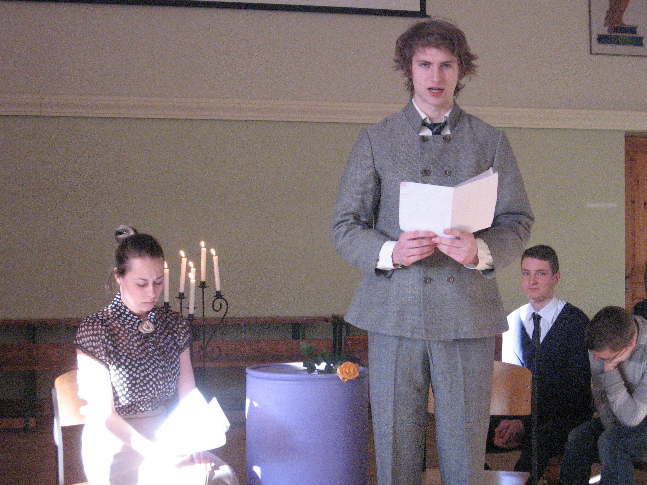 Tālāk skolēnu lasījumā skanēja dzejisks Aspazijas dialogs ar laikabiedru Rūdolfu Blaumani.