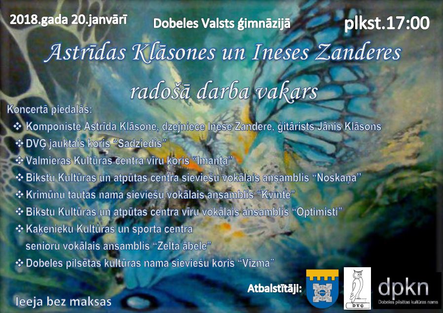 Astrīdas Klāsones un Ineses Zanderes radošā darba vakars 18.01.2018Drukāt atpakaļ Jautājumi, komentāri par rakstu Pievienot
