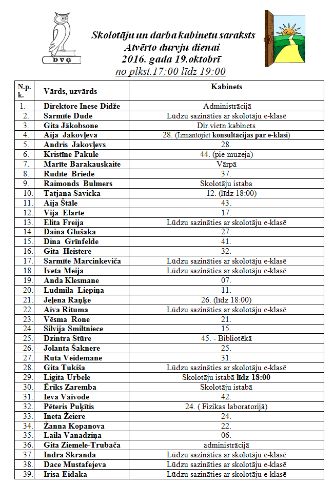 Atvērto durvju diena Dobeles Valsts ģimnāzijā 18.10.201619.oktobrī no 17:00 līdz 19:00 vecāki tiek aicināti uz sarunu ar DVĢ pedagogiem atvērto durvju dienā. Zemāk redzams skolotāju un darba kabinetu saraksts.Drukāt atpakaļ Jautājumi, komentāri par rakstu Pievienot