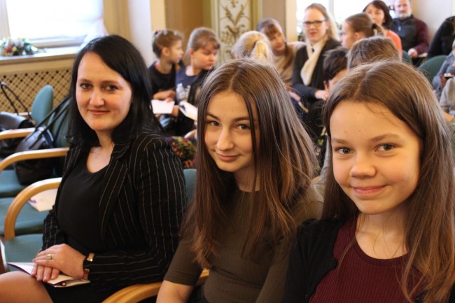 Jasmīna Paškauska (no labās) un Evelīna Katrīna Karņevska Dzimtās valodas dienas pasākumā bija kopā ar savu klases audzinātāju Aiju Štāli.