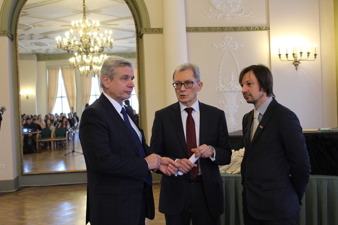 Pasākuma viesis izglītības ministrs Kārlis Šadurskis (no kreisās) sarunā ar Latviešu valodas aģentūras direktoru profesoru Jāni Valdmani.