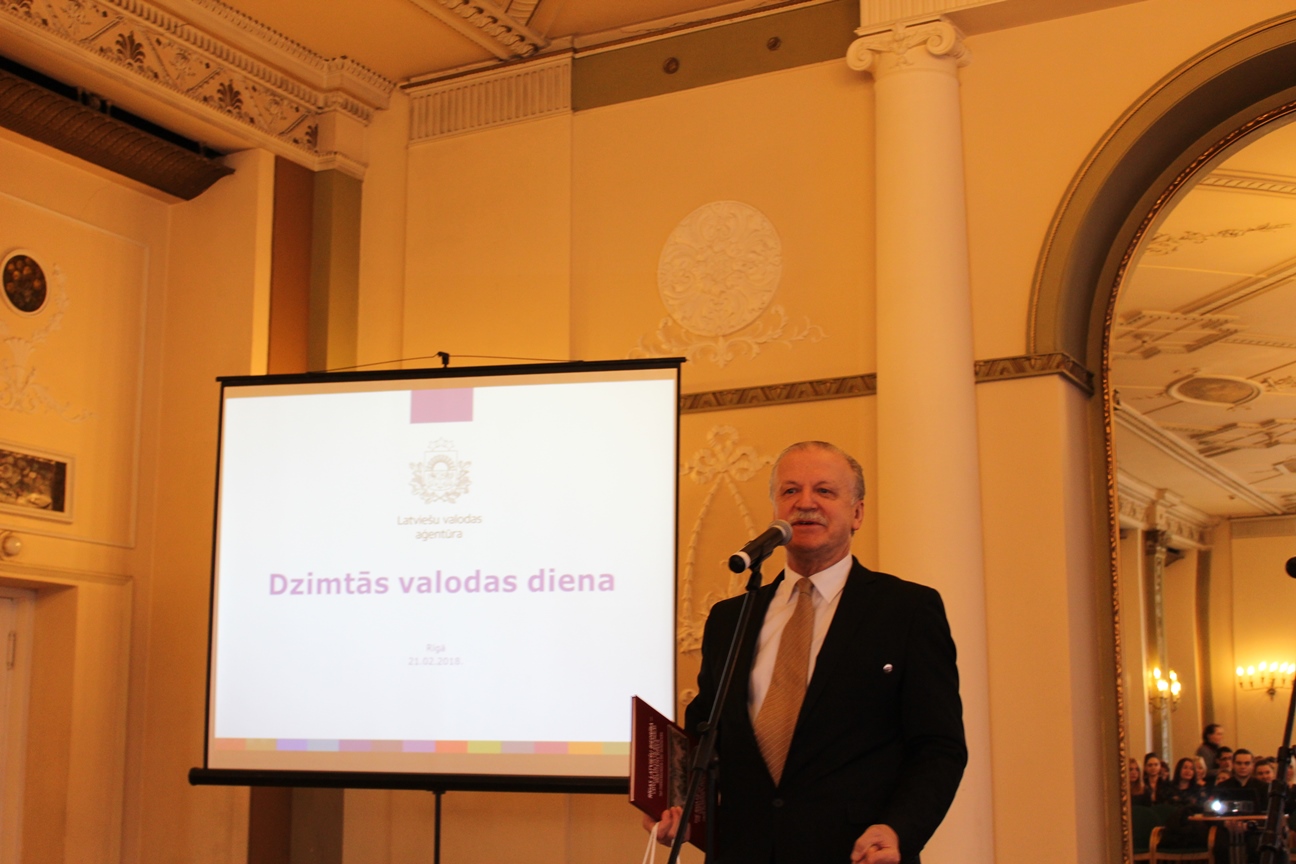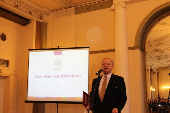 Dzimtās valodas dienas dalībniekus uzrunāja izglītības ministrs Kārlis Šadurskis, uzsverot valodas kā valsts, tautu vienojošā pamata lomu. – Mūsu valoda ir gadu gaitā mainījusies un attīstījusies, un šodien mēs runājam skaistā, bagātā valodā ar lielu dialektu daudzveidību. Pasaulē kopā ir aptuveni 6700 valodu. Latviešu valoda ir starp tām aptuveni 200, kurās runā vairāk nekā miljons cilvēku. Tātad mums ir viena no lielākajām pasaules tautu valodām. Valoda ir mūsu valsts lielākā vērtība, - sacīja ministrs. Viņš arī bilda, ka ministrija pašlaik ir nobeiguma posmā jaunā izglītības standarta izstrādē, un pauda pārliecību, ka šis darbs tiek veikts, lai mūsu nācija sekmīgi attīstītos, lai jaunatne kļūtu arvien gudrāka, spējīgāka, un lai mēs drošu soli ieietu mūsu valsts otrajā simtgadē. Tajā mēs ieejam ar stipru valodu, stipru kultūru, stipru pašapziņu.