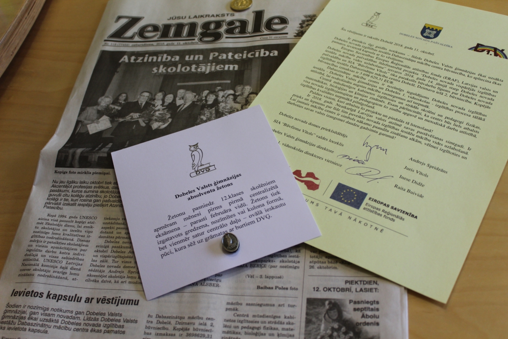 Dobeles Valsts ģimnāzijas Inese Didže kapsulu pildīja ar vietējā laikraksta "Zemgale" 11. oktobra numura eksemplāru, kurā vēstīts gan par novadā apbalvotajiem pedagogiem, gan šodienas vēsturisko notikumu; tika ievietots arī sudrabā darināts Dobeles Valsts ģimnāzijas žetons, 1 eiro monēta, kā arī vēstījums, ko parakstījuši Andrejs Spridzāns, Juris Vītols, Inese Didže un Raita Buivide.