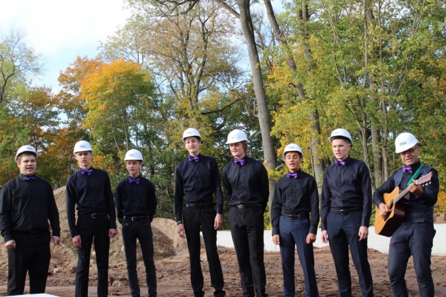 Lai celtniekiem darbi ritētu raiti, uzmundrinošu sveicienu sniedza Dobeles Valsts ģimnāzijas zēnu ansamblis "KPTT".