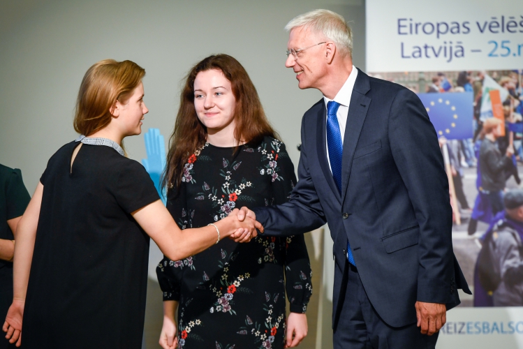 Vēstnieces Madaru Ābomu un Esteri Kristiānu Ozoliņu apsveic Ministru prezidents, bijušais Eiropas Parlamenta deputāts Krišjānis Kariņš.