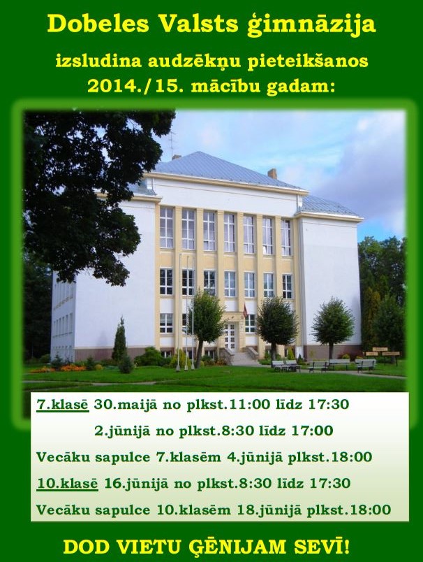 Dobeles Valsts ģimnāzija uzņem skolēnus 2014./2015. mācību gadam 21.05.2014Drukāt atpakaļ Jautājumi, komentāri par rakstu Pievienot