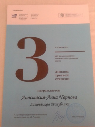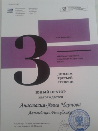 Mūsu Anastasija Anna Černova tika apbalvota ar diviem 3. pakāpes diplomiem: kopvērtējumā un publiskā runās konkursā.