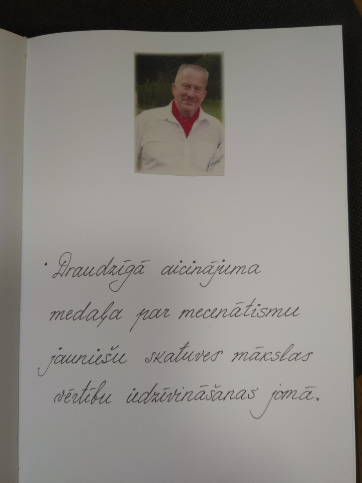 – Mūsu vidū ir bijuši sasniegumi gada garumā, par kuriem esam priecājušies un ko esam atzīmējuši. Tie ir novērtēti arī ārēji. Mūsu Goda siena parasti papildinās Valsts svētku zīmē, atskatoties uz periodu no iepriekšējā gada 18. novembra. Šajā laikā Dobeles Valsts ģimnāzijā ir notikušas daudzas jaukas lietas. Viena no tām: Draudzīgā Aicinājuma fonds apbalvojis mūsu skolas ļoti lielu atbalstītāju, tobrīd aktīvu vecāku Augustu Mešķi par nesavtīgu ieguldījumu Dobeles Valsts ģimnāzijas teātra mākslas attīstīšanā, skolas padomes darba atbalstīšanā un par iesaistīšanos dažādos mūsu pasākumos. Mēs sakām viņam paldies par šo ieguldījumu, -