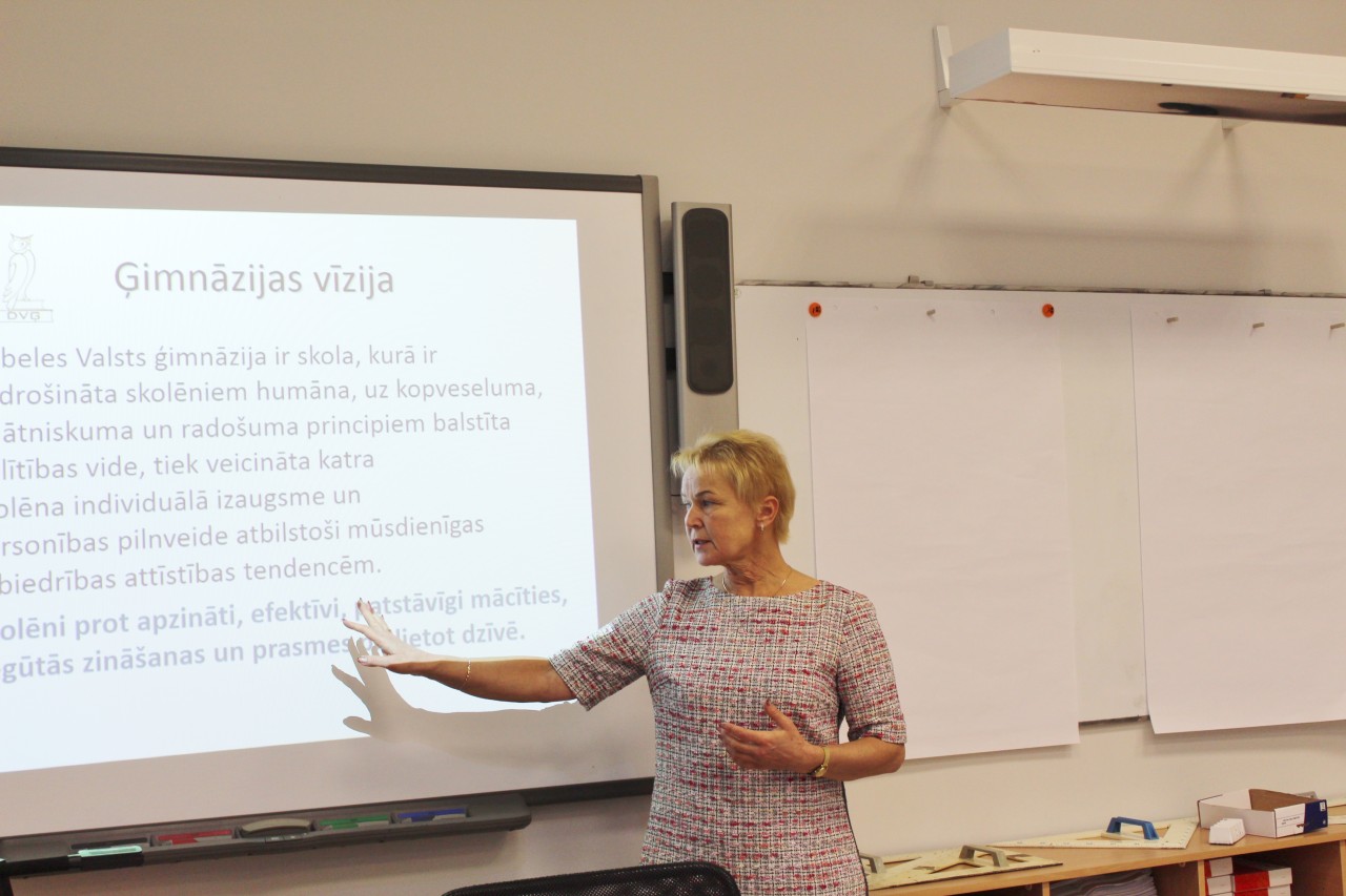 Ģimnāzijas direktore Inese Didže sniedza prezentāciju par skolas mērķiem un vīziju izglītības kvalitātes paaugstināšanas kontekstā, atziņas, novērojumus un pierādījumus par situāciju skolā, idejas, kā ikdienā veidot motivējošu un apzinātu mācību vidi, lai skolēni būtu izvērtētspējīgi, spētu plānot savu mācīšanās procesu, lai iznākumā saņemtu gaidītos rezultātus, ar kuriem mēs lepojamies. Direktore akcentēja vienu no galvenajiem skolas mērķiem: panākt, ka skolēni prot apzināti, efektīvi un apzināti mācīties un iegūtās zināšanas un prasmes pielietot dzīvē. Nav mainījusies ģimnāzijas misija – sagatavot motivētus skolēnus studijām augstskolā un mūžizglītībai. Arī skolas vērtības ir nemainīgas – radošums, sadarbība, kvalitāte.
