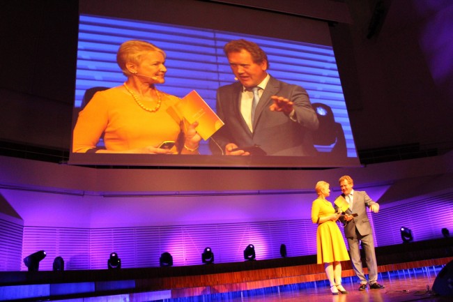 Populārais TV žurnālists, konferences vadītājs Haralds Burkovskis piesaka DVĢ direktores Ineses Didžes uzstāšanos.