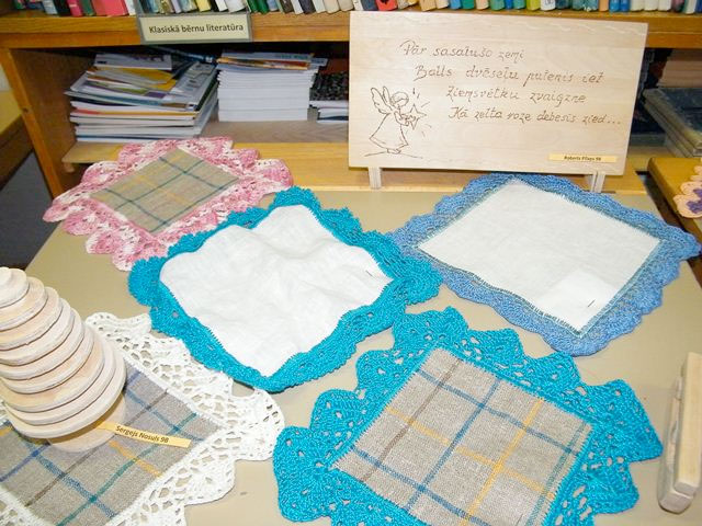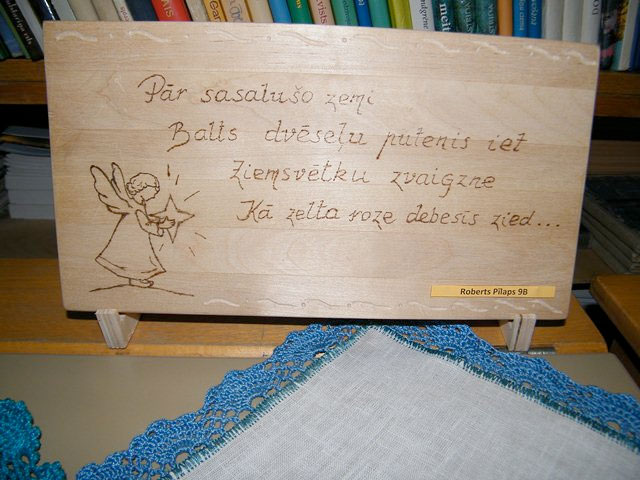 Tuvojoties Ziemassvētkiem, skolas bibliotēkā tiek rīkota skolēnu, mājturības stundās gatavoto, praktisko darbu izstāde. Septītās klases skolēni rāda savu veikumu, izgatavojot palikni karsto priekšmetu novietošanai, astotās klases zēni veido sienas dekoru, izmantojot rudenī sagatavotos dabas materiālus, devītās klases skolēni izgatavo dekorus Ziemassvētkiem pēc savas izvēles. Šie darbi būs kā Ziemassvētku dāvana vecākiem. Tradicionāli sadarbojamies arī ar skolēnu pašpārvaldi un, tuvojoties Ziemassvētku ballei, cepam piparkūkas un domājam par to iesaiņojumu (kartona kastīte), noformējumu (aplikācija) un apsveikumu. Šogad tas ir saistīts ar ticējumiem Ziemassvētkos. Mūsu sagatavotie apsveikumi tiek izlietoti skolas Ziemassvētku pasākuma aktīvāko dalībnieku un konkursu uzvarētāju apbalvošanai. Skolēnu individuālo darbu izstādes atklāj viņu radošumu, atbildību par rezultātu, savu spēju, prasmju pierādījumu. Kā tas mums ir izdevies var aplūkot fotogrāfijās. Mājturības skolotājs A.Jakovļevs 2012. decembris