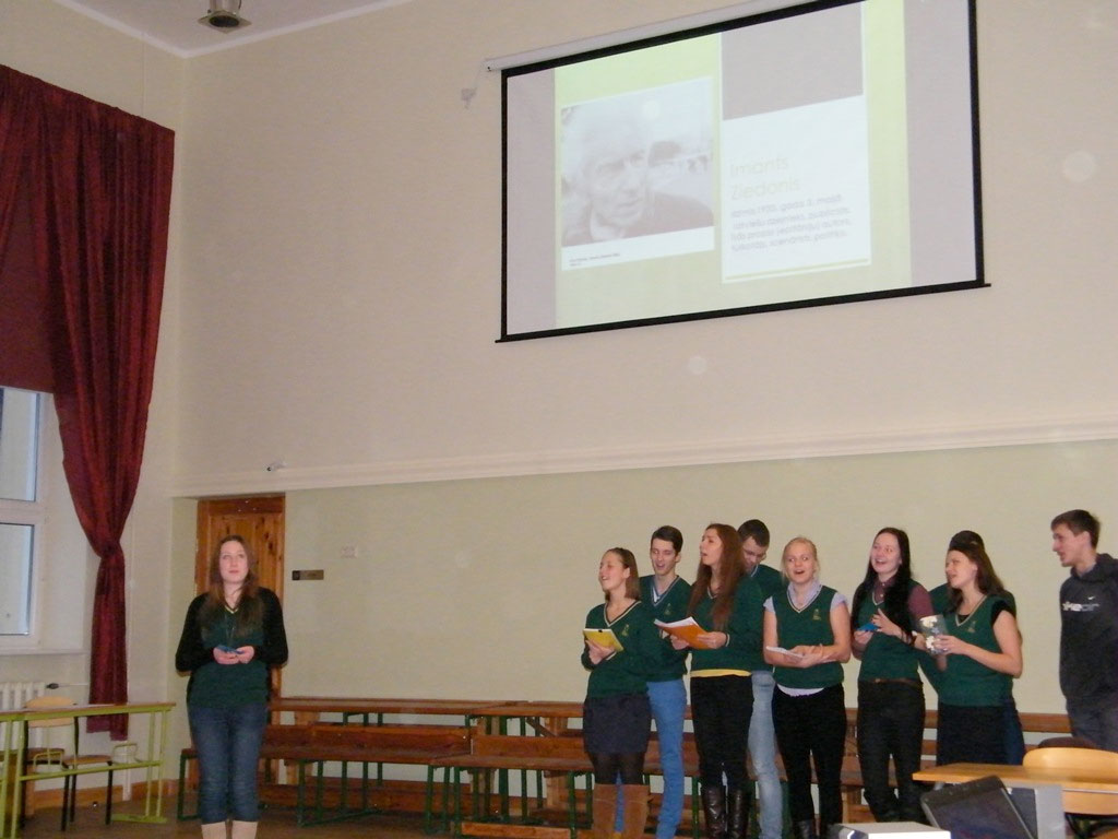 29. janvāra rīts visām 12. klasēm sākās ar kopīgu literatūras stundu, kas veltīta Imantam Ziedonim. Sākumā skatījāmies videomateriālus par dzejnieku, pēc tam katra 12. klase nodziedāja kādu dziesmu ar Imanta Ziedoņa vārdiem. Jautri un nopietni bija arī divpadsmitklasnieku veidotie dzejnieka darbu iestudējumi. Pēc tam sekoja iesildīšanās jautājumi par dzejnieka dzīvi un darbiem. Tad konkurss turpinājās pa darba grupām – sacentās katras klases labākie zīmētāji, dziedātāji, aktieri, I.Ziedoņa dzīves un darbu zinātāji. Valdīja radoša, brīva, draudzīga atmosfēra. Beigās katra klase saņēma diplomu: