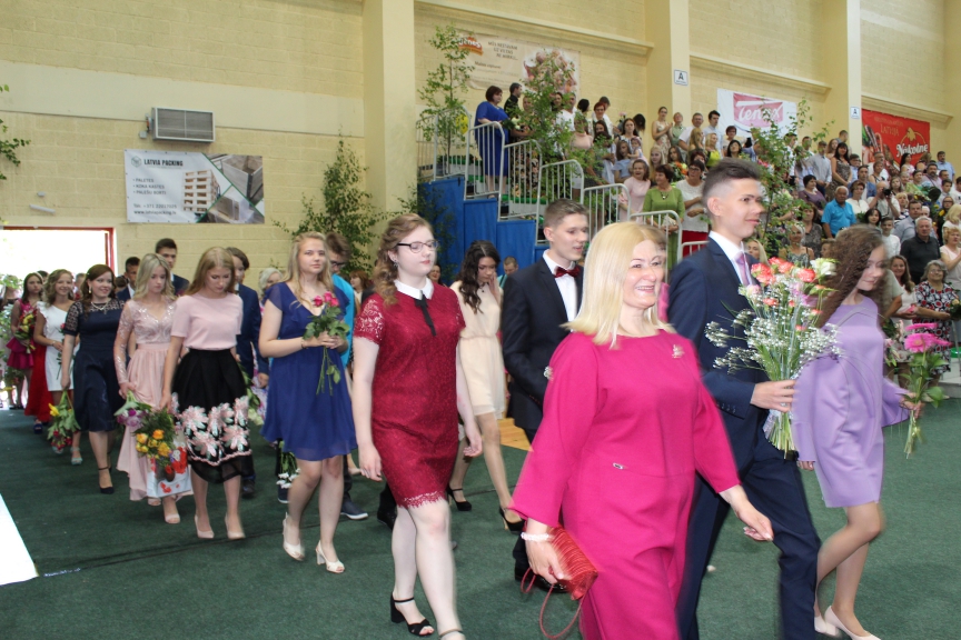 Pēc ģimnāzijas karoga svinīgas nodošanas nākamajiem "divpadsmitajiem" absolventi savu klašu audzinātāju vadībā izsoļoja arī goda apli pa Sporta halli.