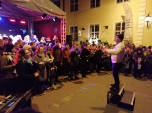 Kori uzstāšanās brīdī Kara muzeja pagalmā fotografēja ģimnāzijas direktore Inese Didže, kura atzina: - Paldies kora skolotājam Raimondam Bulmeram un kormeistarei Sandrai Bulmerei, kā arī kora "Sadziedis" jauniešiem par līdzdalību sadziedāšanās pasākumā svētdien vakarā - 11. novembrī Rīgā, Kara muzeja pagalmā. Man bija patiess prieks redzēt savējos pieskandinām Rīgu!