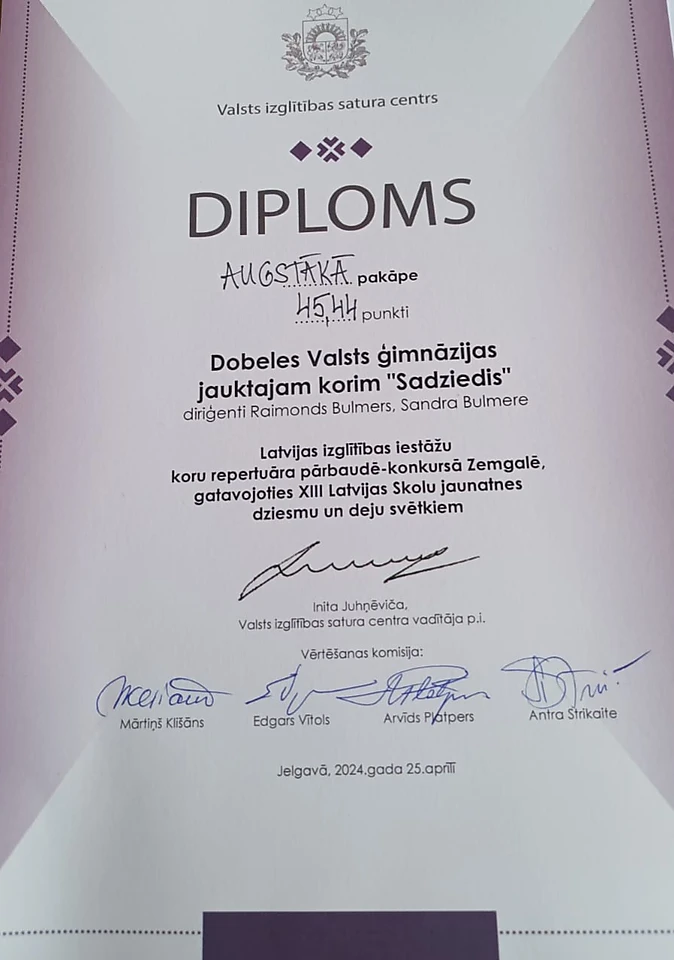 Šodien, 2024.gada 25.aprīlī, Dobeles Valsts ģimnāzijas jauktais skoris "Sadziedis" saņēma augstāko pakāpi Latvijas izglītības iestāžu koru repertuāra pārbaudē - konkursā Zemgalē, gatavojoties XIII Latvijas Skolu jaunatnes dziesmu un deju svētkiem. Mūsu koris ieguva 45,44 punktus. Paldies jauniešiem un kora vadītājam Raimondam Bulmeram un kormeistarei Sandrai Bulmerei!