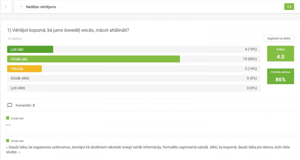 - Nodrošināt katram atgriezenisko saiti. Bet visvairāk iepriecināja skolēnu novērtējums, ka viss ir saprotami, labi un nav pārslodzes.