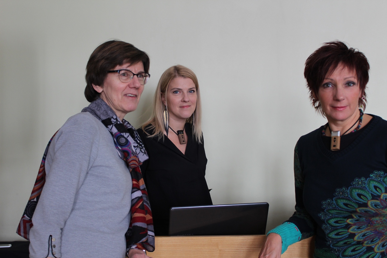 Pirms noslēguma tikšanās ar pasākuma dalībniekiem – skolotāja Aija Jakovļeva (no kreisās) sarunā ar žurnālisti Ilzi Jakovļevu un tulkotāju Daci Andžāni.