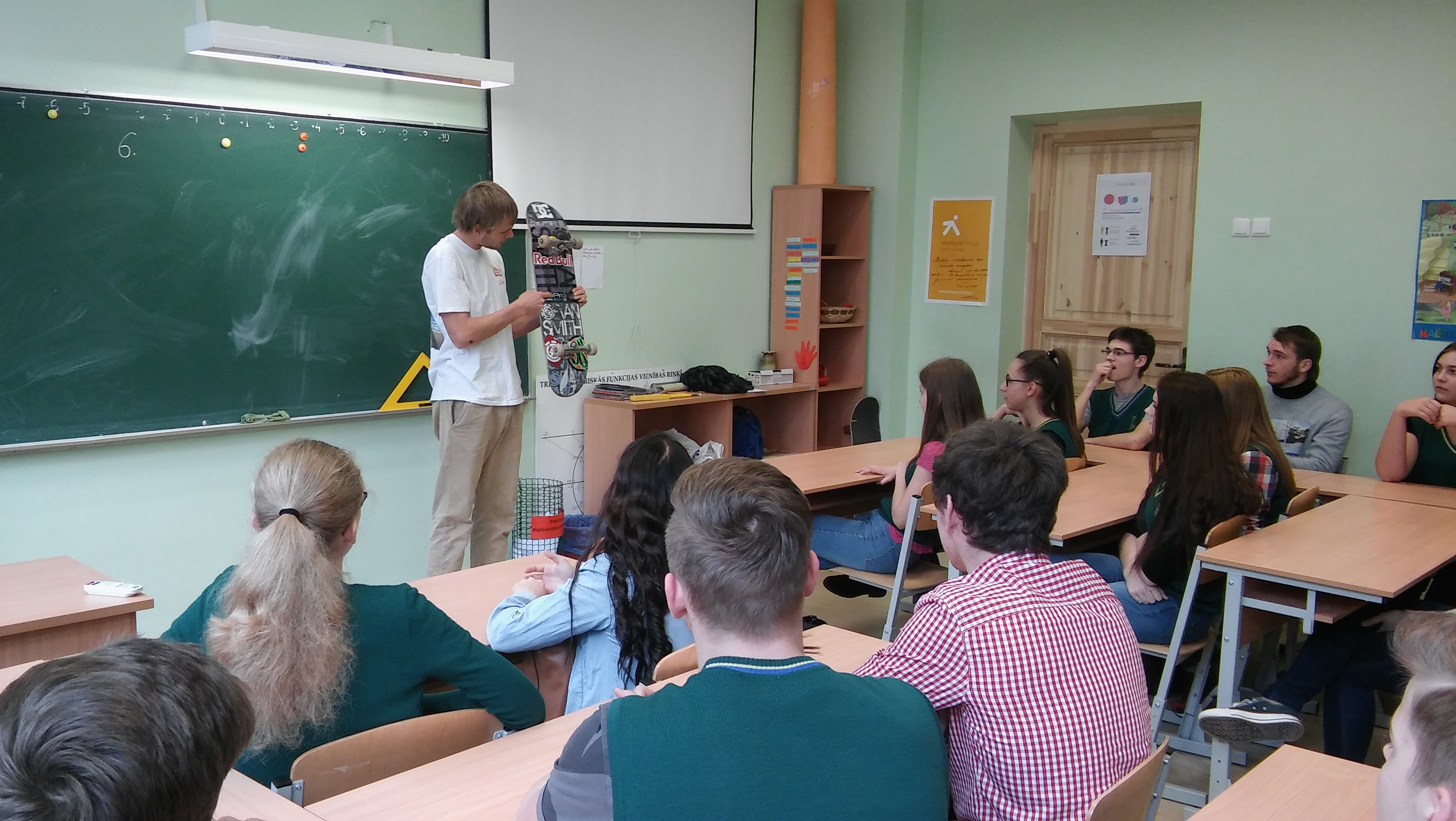 Madars ar klasi dalījās savā pieredzē, kā viņš sasniedza pasaules skeitborda eliti. Tāpat viņš papildināja savu vizīti ari interesantiem stāstiem no viņa dzīves. Viņs mūs visus iedvesmoja darīt to, ko mēs vēlamies, tā, lai uz darbu dotos ar smaidu.