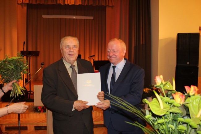 Dobeles novada domes priekšsēdētājs Andrejs Spridzāns pasniedzis IZM Atzinības rakstu Pēterim Puķītim.