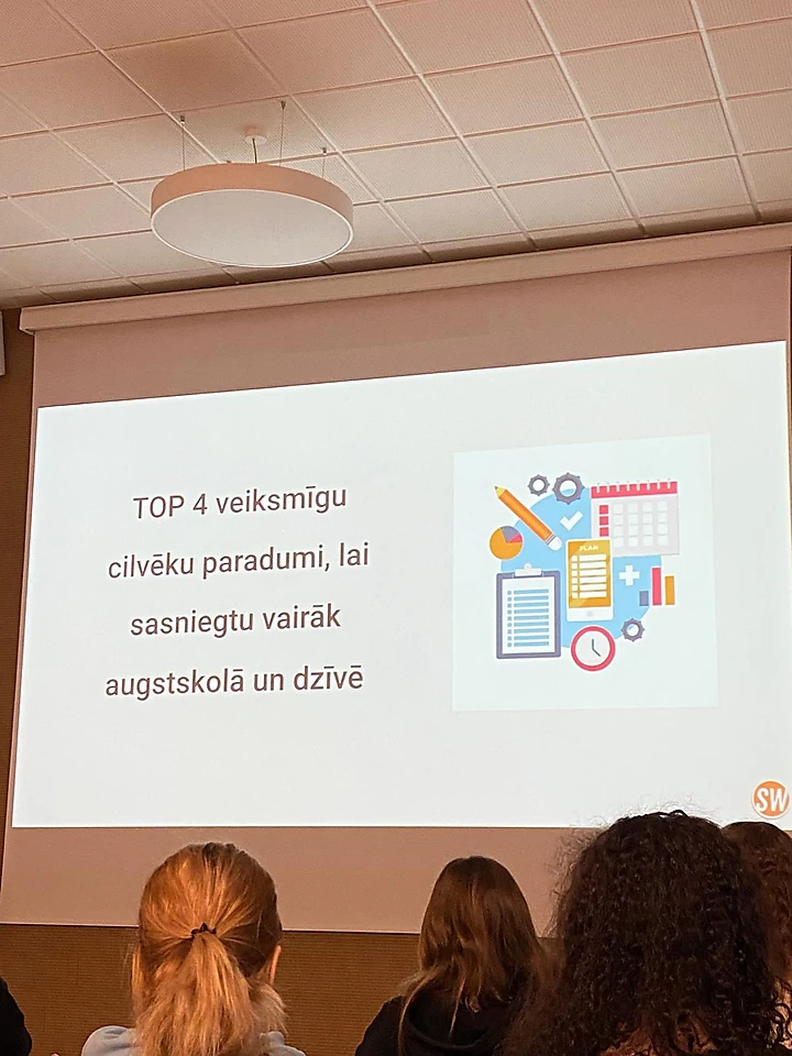 Šodien 11. decembrī 11 IV un 12 V klases skolēni piedalījās nodarbībā ar Rīgas Stradiņa universitātes (RSU) trešā kursa studentu Rolandu Indričānu, kurš dalījās savā pieredzē par pašattīstību, mērķu sasniegšanu un palīdzību citiem.