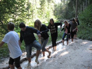 Ar tālskati no skatu torņa aplūkojām neskartās dabas panorāmu - purva ezeriņus un akačus. Pēc tam savu ceļojumu turpinājām pa Baskāju taku, pārvarot dažādus šķēršļus, izejot labirintu, brienot pa upīti, izbaudot,kādas sajūtas ir staigājot pa dažādām virsmām, pēdām saskaroties ar dabas materiāliem. Orientējāmies dabā, mācījāmies sadarboties komandās pa 3 dalībniekiem katrā, meklējām kontrolpunktus pēc fotogrāfijām. Labāk veicās mūsu klašu meitenēm: Ivetai, Elīzei, Guntai, Adrijai, Alisei un Ilutai, kuras izcīnīja Valguma pasaules čempiona kausu un augu pases, bet puiši bija veiklāki bumbas spēlē. Šūpojāmies, spēlējām bumbu, smējāmies, priecājāmies par sauli, sevi un atkalsatikšanos pēc vasaras brīvlaika. Mums bija jautri!