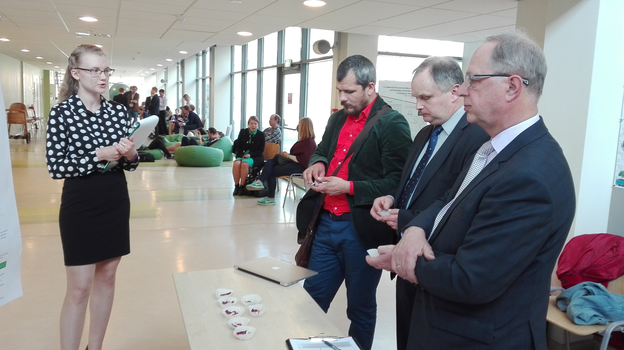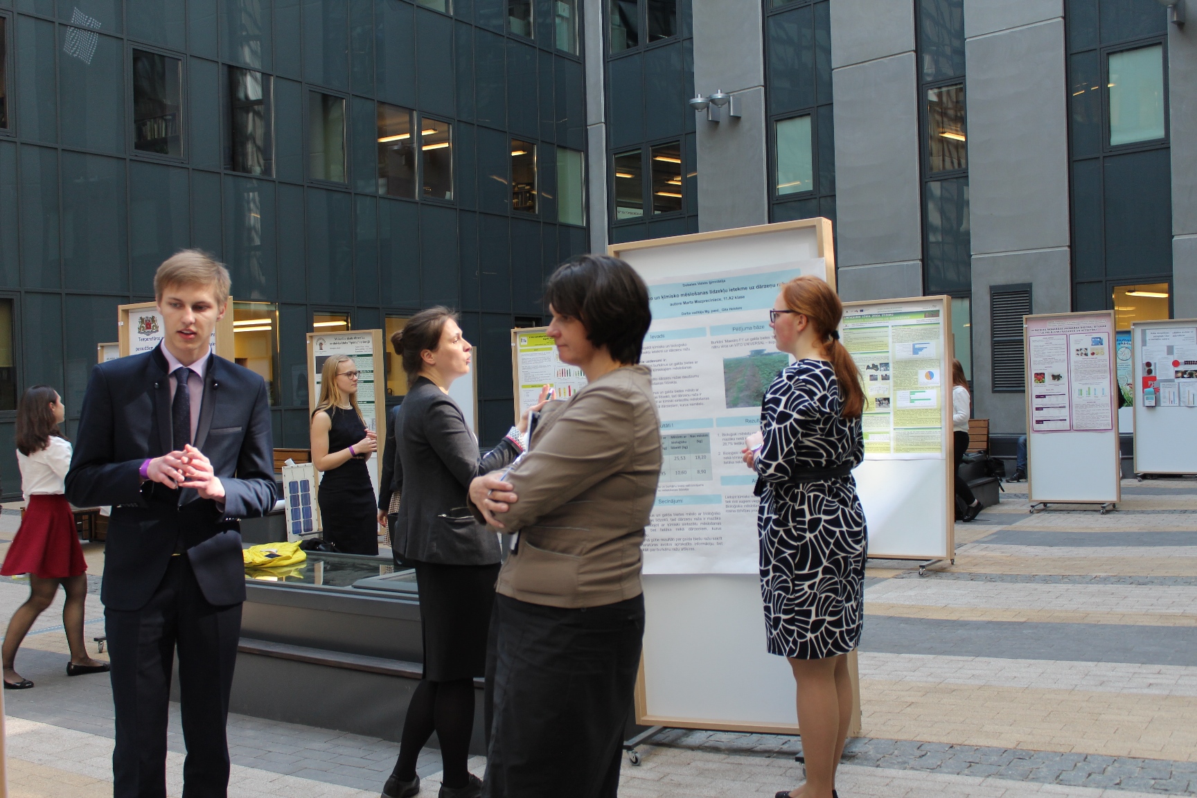 Dabaszinību centra stiklotajā iekšpagalmā tika izvietoti 46 prezentāciju stendi. Katram autoram par savu pētījumu vajadzēja stāstīt trim vērtētājiem dažādā laikā. Martai un Tomam divas no trijām prezentācijām notika vienlaicīgi.