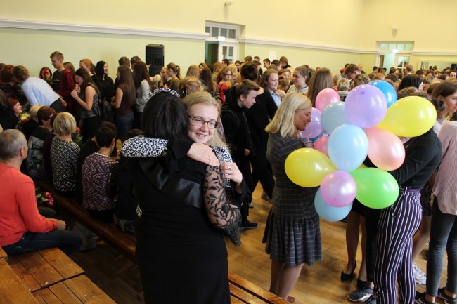 Vēlāk ģimnāzijas zālē tika godināti valsts un pašvaldības apbalvojumus saņēmušie skolotāji Pēteris Puķītis, Vija Elarte un aplausi veltīti pensionētajai skolotājai Dinai Grīnfeldei. Savā svētku dienā skolotāji kopīgi nofotografējās un saņēma daudz, daudz mīļu buču, ziedus un dāvaniņas no skolēniem.