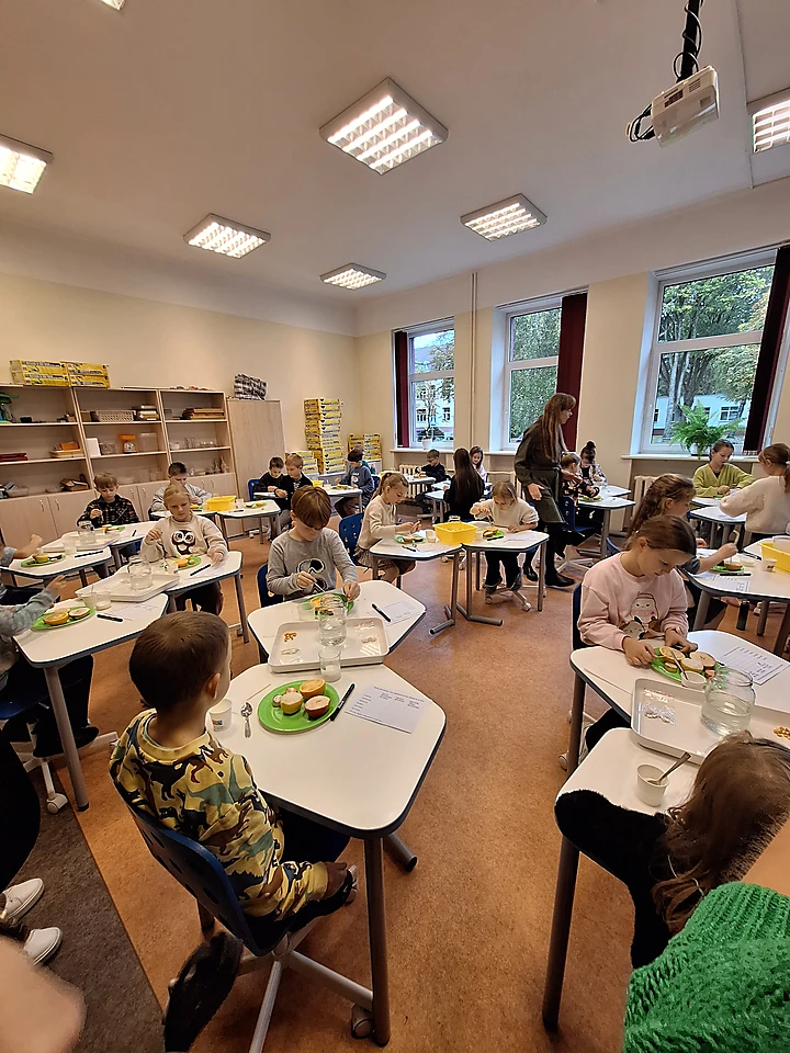 Tālāk sekoja STEM aktivitāšu vērošana un dalība mācību procesā. 4.klases stundas tēma bija “Augļu un dārzeņu skābuma noteikšana”, kur skolēni praktiski darbojoties noteica skābes klātbūtni dažādos augļos un dārzeņos. Bērni ar lielu interesi un ziņkāri pildīja uzdevumus.