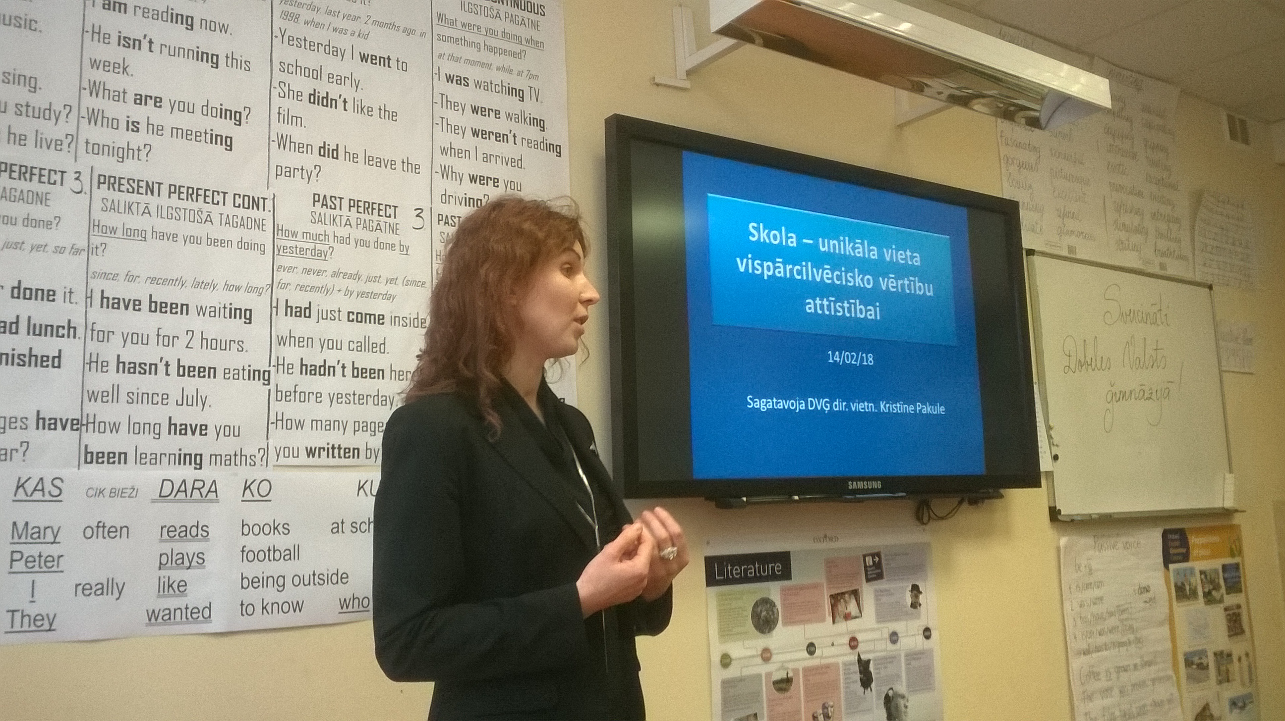 Direktores vietniece audzināšanas jomā Kristīne Pakule bija sagatavojusi izsmeļošu prezentāciju par ģimnāzijas audzēkņu aktivitātēm, kas apliecina skolas kā unikālas vietas vispārcilvēcisko vērtību nodrošināšanā lomu. Skolotāja dalījās atziņās, kas iegūtas, piedaloties pērn Latvijas Universitātē notikušajā Latviskuma konferencē. Viena no tādām: skola ir vieta, kur jauno cilvēku kā tīrradni slīpē visās iespējamās šķautnēs – radošumā, talantos, patriotisma, ētikas, sadarbības izpratnē, komunikācijas un citās prasmēs, tostarp – iegūto zināšanu izmantošanā praktiskās jomās. Ģimnāzijā šo misiju veic visdažādākie pasākumi, aktivitātes un nodarbes, kur jaunais cilvēks var iesaistīties ārpus mācību darba. Kristīne Pakule uzsvēra: - Šim procesam ir nozīme tad, ja tas ir jēgpilns. Mēs, skolotāji, neko nevaram skolēniem uzspiest, tikai piedāvāt. Bet personības audzināšanai jānorit tā, lai audzināšanas darbs būtu vērsts uz atbildības, centības, drosmes, godīguma, gudrības, tolerances, līdzcietības, mērķtiecības, mājas izjūtas visplašākajā izpratnē veidošanu jaunajā cilvēkā. Mēs to cenšamies darīt.