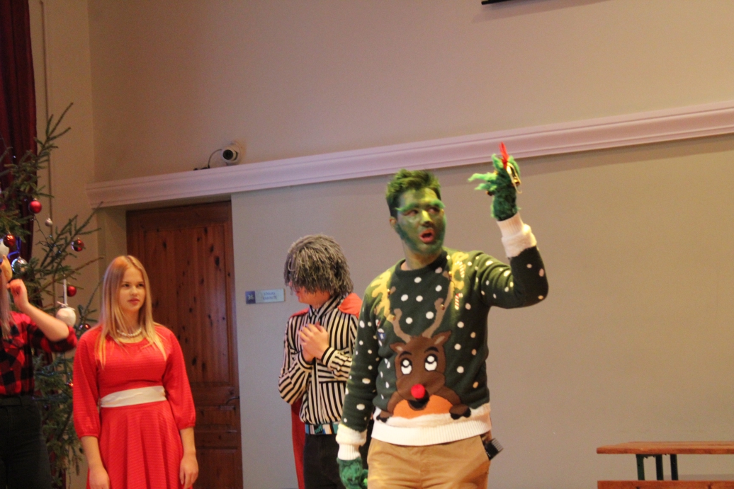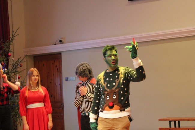 Divos "cēlienos" - 7. - 9. klašu un 10. - 12. klašu grupās - skolēni, pedagogi un ģimnāzijas darbinieki baudīja patiešām atraktīvu un saistošu "jampadrača" dalībnieku sniegumu, dzīvojot līdzi norisēm ģimeniskās Ziemassvētku svinībās kopā ar Rūķiem un Grinču un priecājoties par dejotāju un dziedātāju priekšnesumiem.