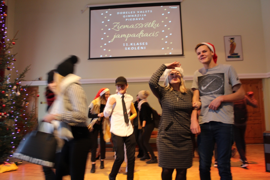 Kopbildē ar ģimnāzijas direktori - "Ziemassvētku jampadrača" īstenotāji - 11. klašu skolēni.
