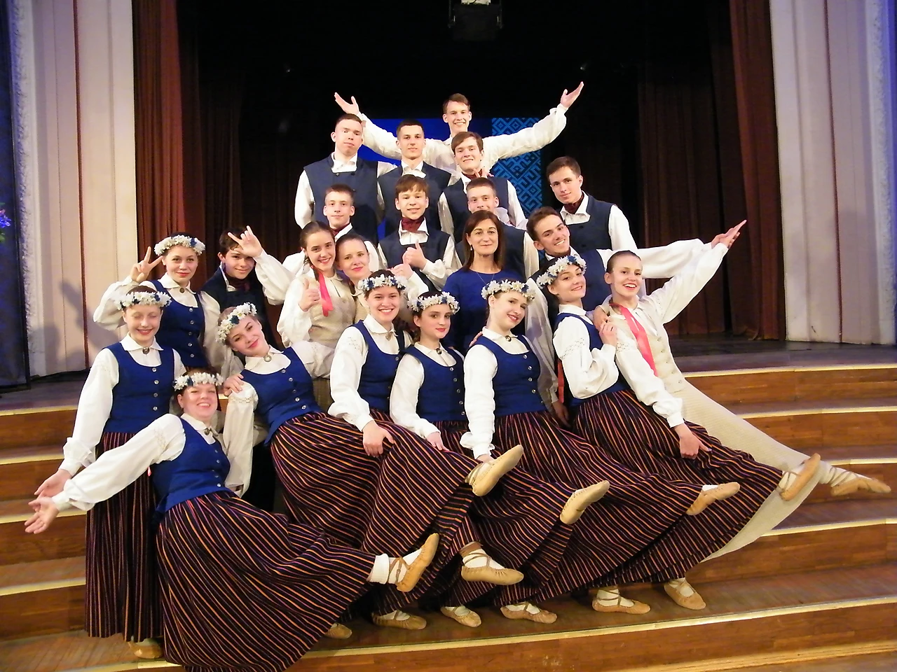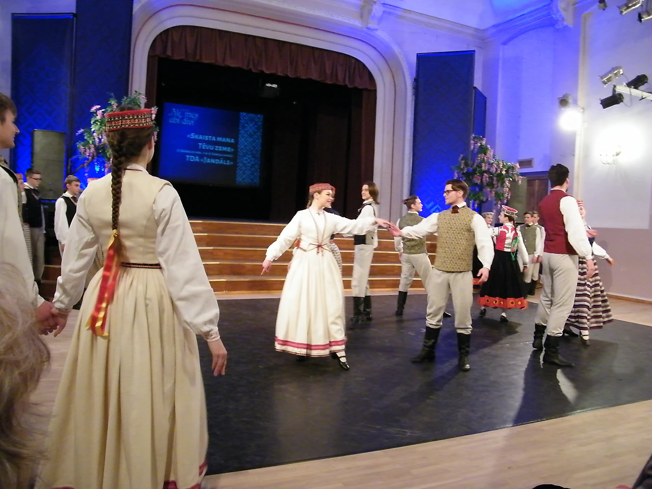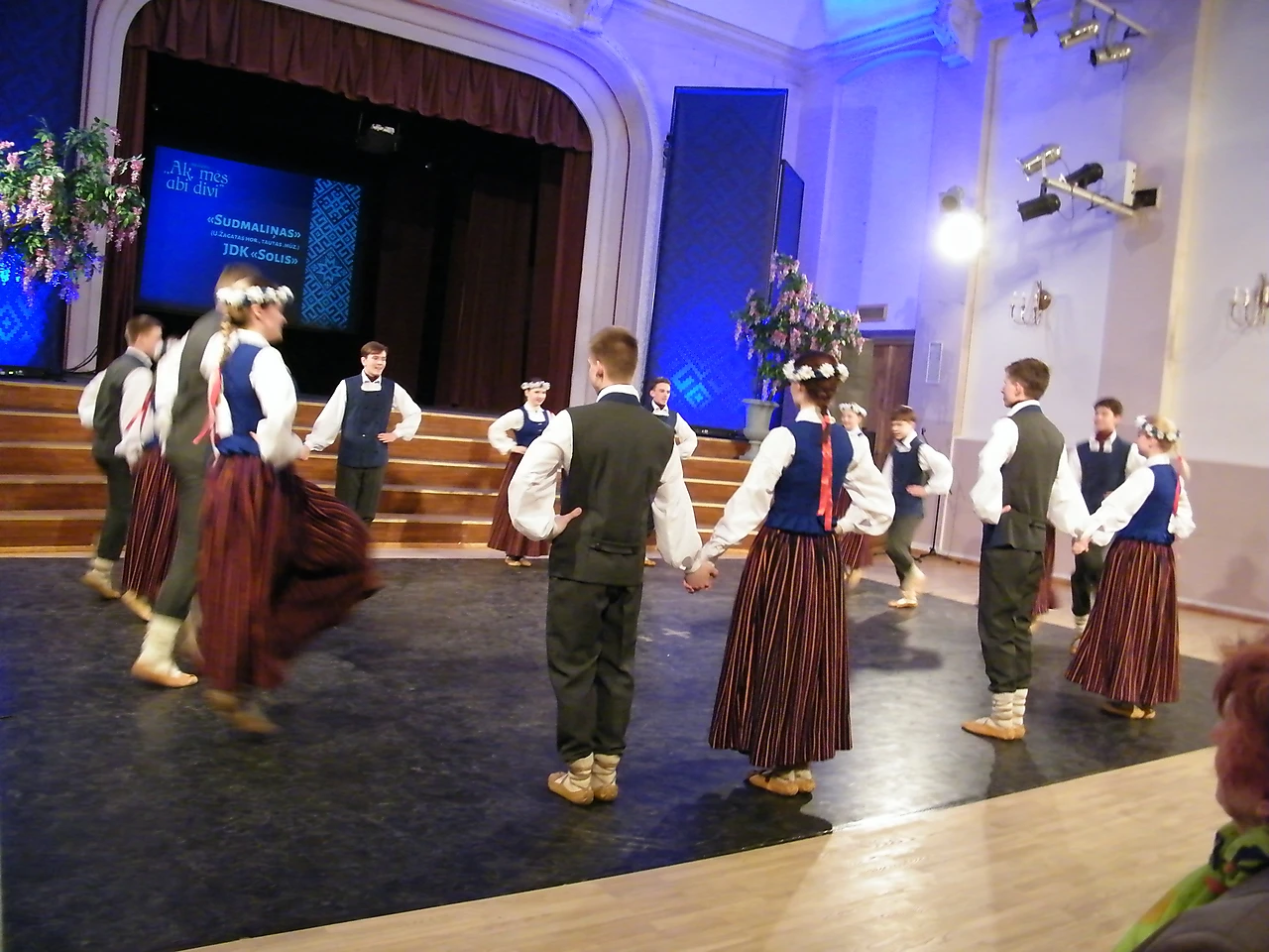 Pēc tam sākās īstā rosība. Ģērbtuvē uzmanīgi tika uzvilkti tērpi, meitenes viena otrai sapina bizes, puiši palīdzēja sasiet lakatiņus. Drīz vien sākās koncerts un sākās manāms satraukums, tāpēc vienojāmies kopīgā kolektīva tradīcijā- saucot mūsu saukli: “Kas tur soļo, kas tur dzied-solis, solis dancot iet.” Tad jau pienāca arī laiks doties uz skatuves un dejotu mūsu skaistās dejas- “Parādies, Tu saulīte”, “Cūkas driķos” un “Sudmaliņas”.