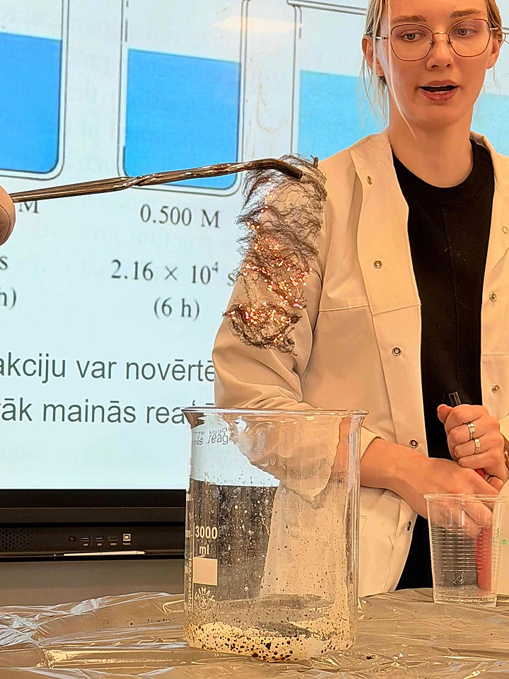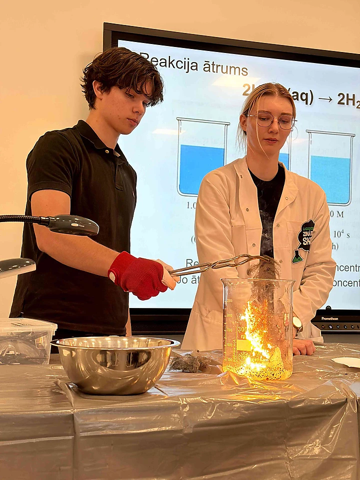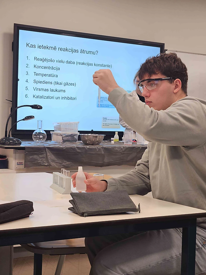 10.IV klases skolēni piedalījās izzinošā un praktiskā nodarbībā “Ķīmiskās reakcijas ātrums”. Nodarbības laikā skolēni atkārtoja un nostiprināja zināšanas par to, kādi faktori ietekmē ķīmisko reakciju norisi, un kā skābeklis mijiedarbojas ar dažādām vielām. Skolēni uzzināja, kā koncentrācija, temperatūra, katalizatori un virsmas laukums var būtiski mainīt reakciju ātrumu. Teorētiskās zināšanas tika papildinātas ar praktiskiem demonstrējumiem un diskusijām, kas ļāva labāk izprast procesus, kas notiek gan ikdienā, gan laboratorijā. Praktiskajā daļā skolēni paši veica eksperimentu, novēroja reakcijas norisi un rūpīgi pierakstīja mērījumus. Iegūtie dati tika analizēti un attēloti grafikā, kas palīdzēja vizuāli saskatīt reakcijas ātruma izmaiņas un izdarīt secinājumus. Nodarbība bija gan aizraujoša, gan izglītojoša, tā stiprināja skolēnu prasmes pētīt, analizēt un izprast ķīmiskos procesus, vienlaikus radot patīkamu un iedvesmojošu mācību atmosfēru.