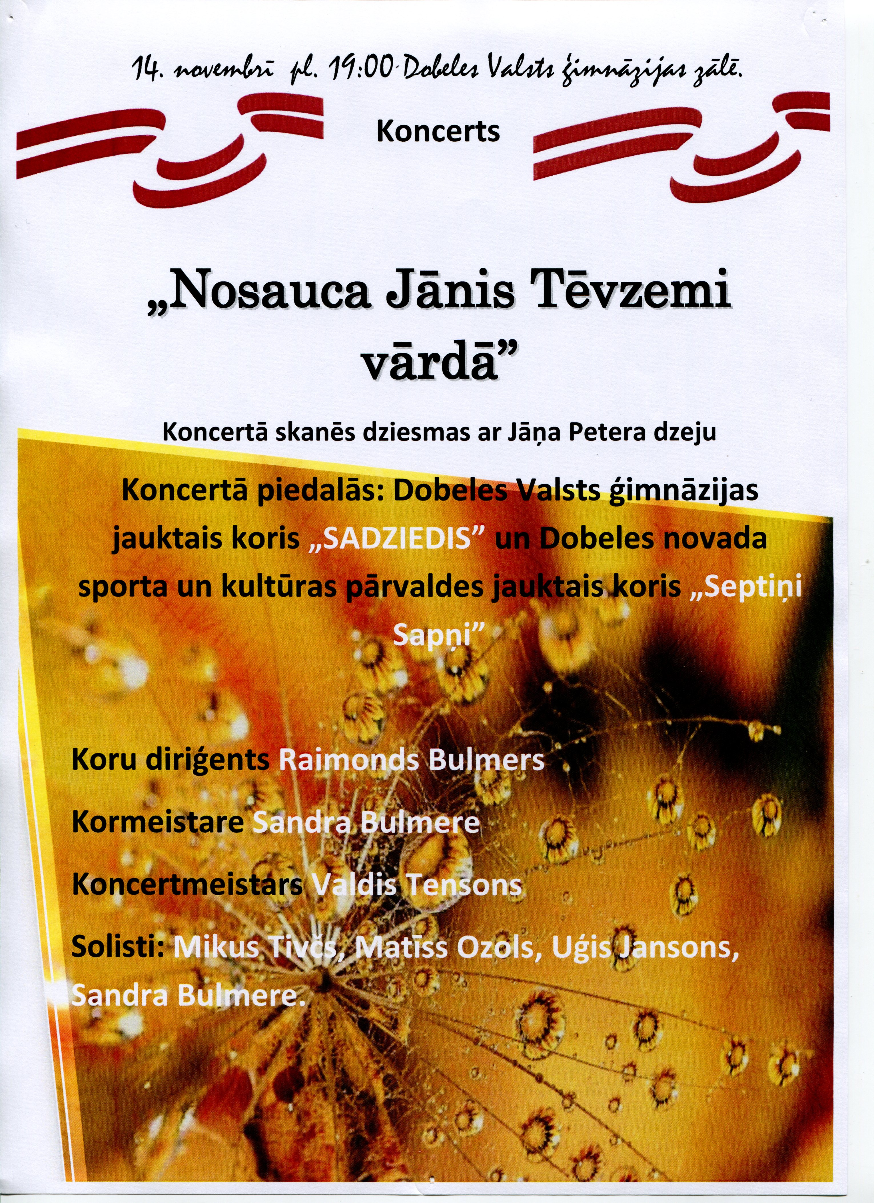 14.novembrī Dobeles Valsts ģimnāzija aicina apmeklēt koncertu "Nosauca Jānis Tēvzemi vārdā", kas veltīts Latvijas Republikas proklamēšanas dienai. Piedalās DVĢ koris "Sadziedis" un jauniešu koris "Septiņi sapņi".
