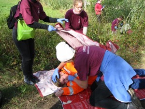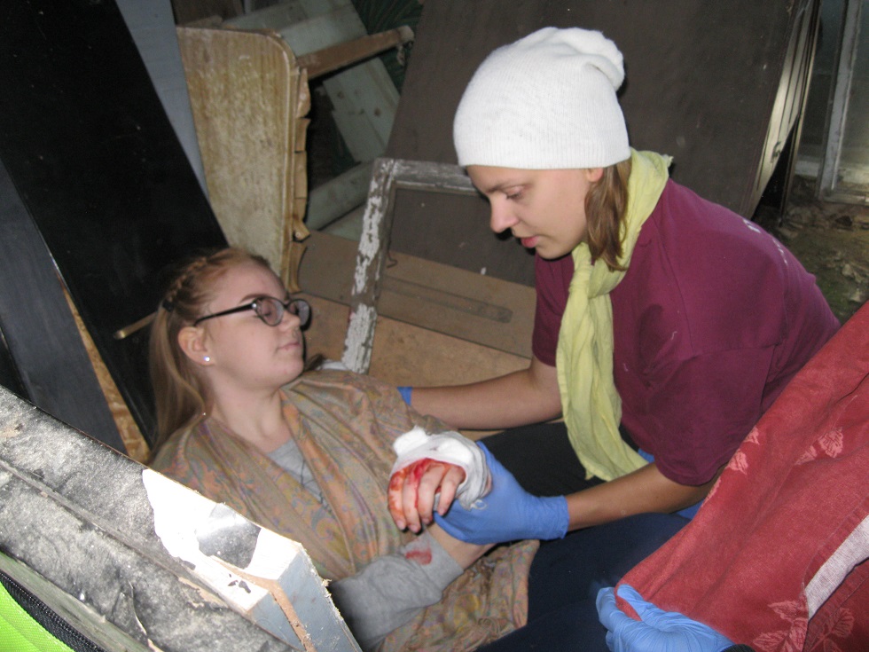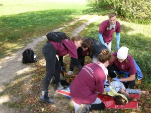 Ģimnāzisti sniedz pirmo palīdzību "avārijā cietušajiem".