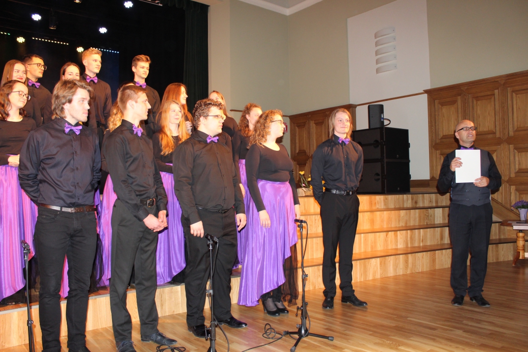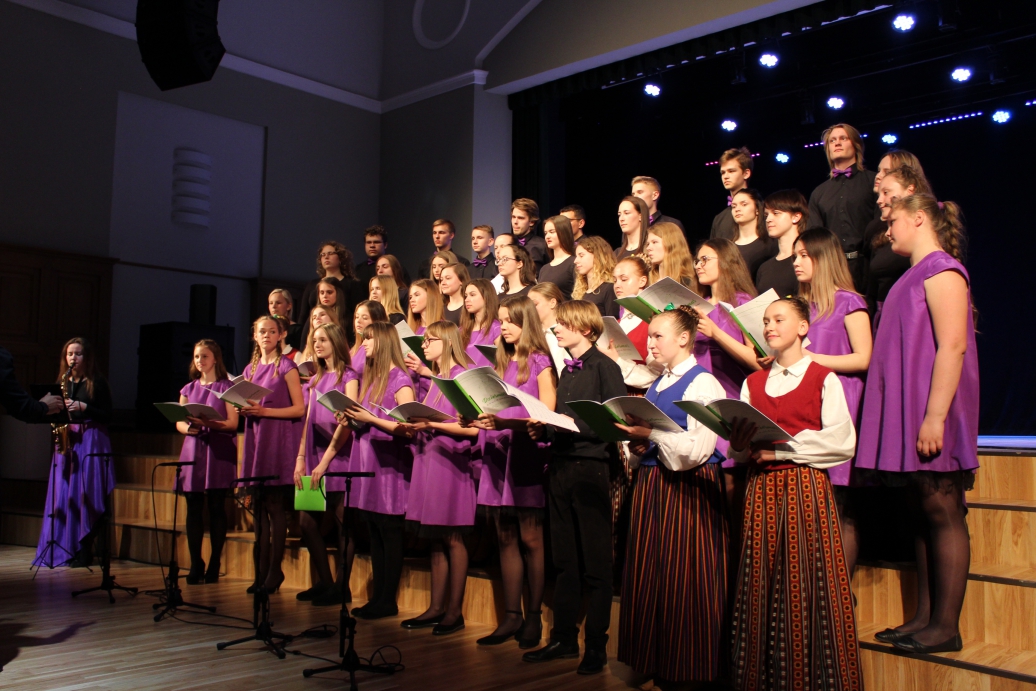 Muzicē kori "Dzirkstele" un "Sadziedis" kopā ar jauno saksofonisti Esteri Kristiānu Ozoliņu.