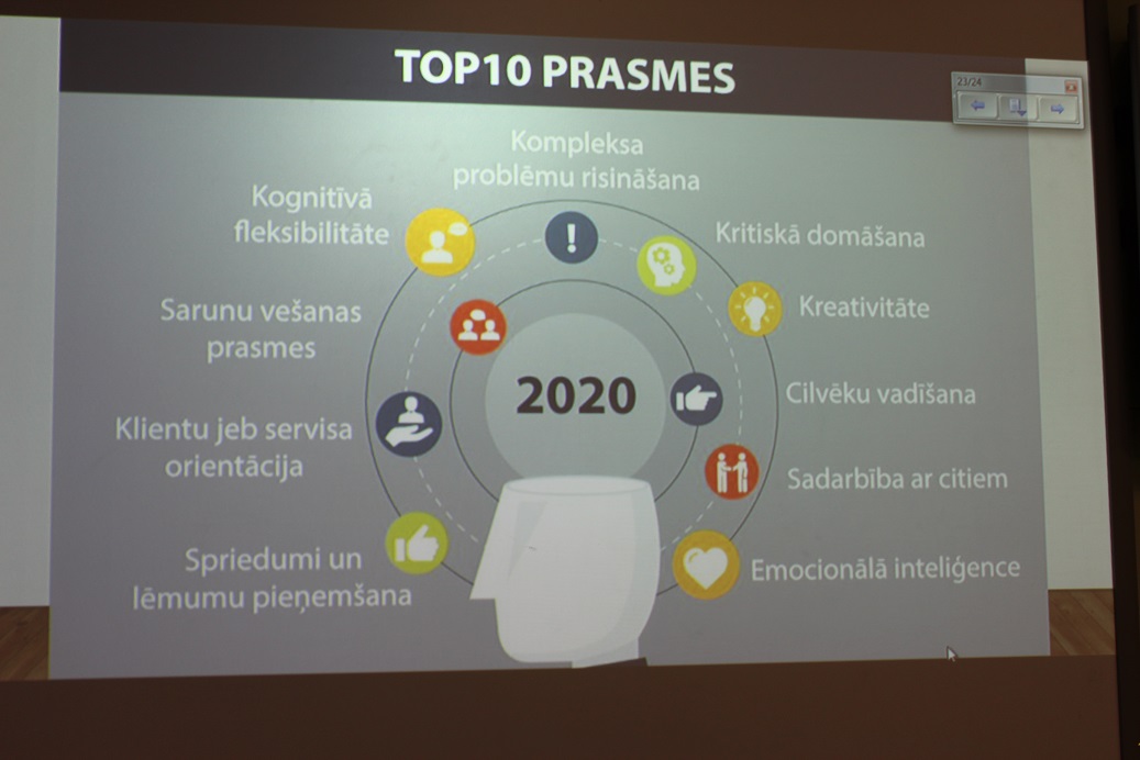 Konsultante norādīja, ka nereti ir izteikta "plaisa" starp to, kas mēs esam tagad un ko gribam sasniegt. Būtiski ir saprast, kā vēlamo īstenot. Nodarbības dalībniekiem tika uzsvērts, ka šodien ir nepieciešamas nevis šauras zināšanas un prasmes konkrētā nozarē, jo daudzviet tās aizvieto mūsdienu tehnoloģijas. Konkurētspēju darba tirgū šolaik garantē daudzpusīgas un plašas kompetences, tostarp komunikācijas prasmes: sarunu vešana, orientēšanās uz klientu, pārdošanas prasmes, cilvēku vadīšanas prasmes, sadarbība, emocionālā inteliģence; arī radošums, kritiskā domāšana, spēja pieņemt lēmumus. Šīs prasmes ir jāveido un jātrenē.