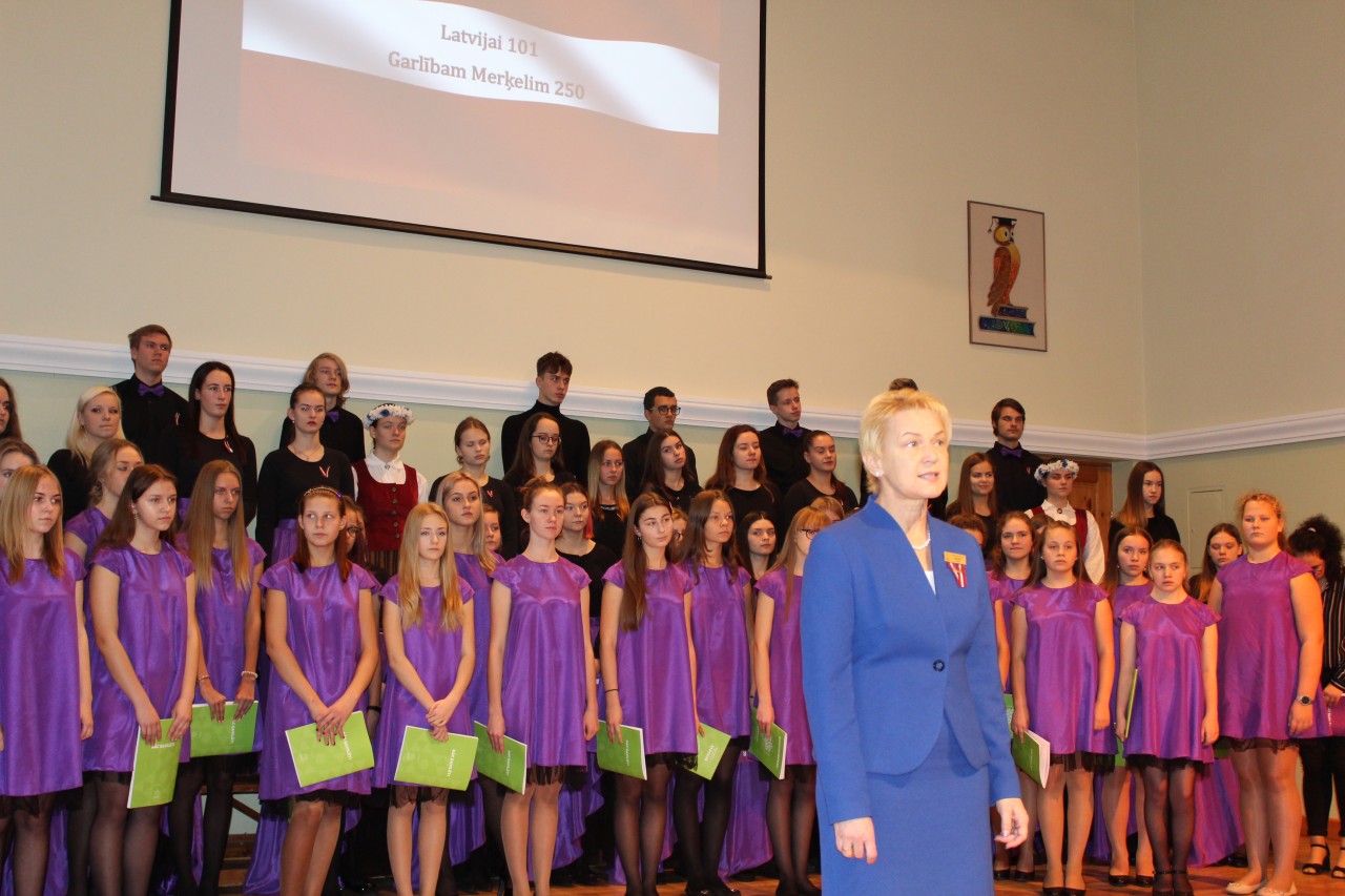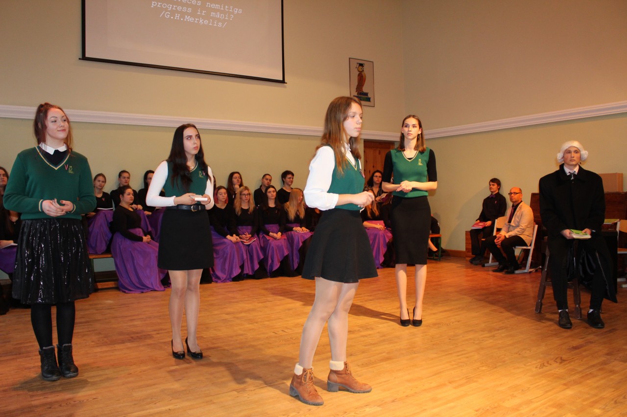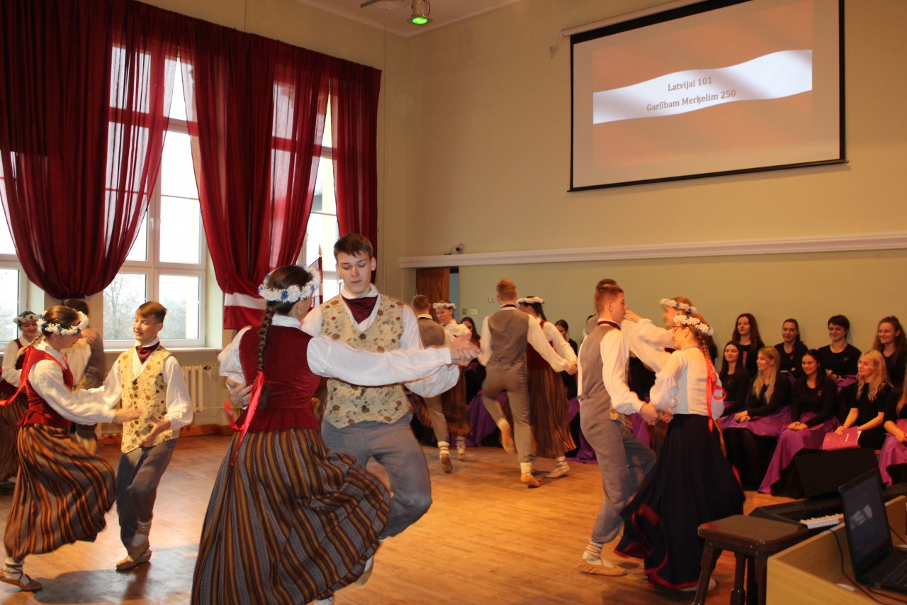 Tā kā šogad tiek atzīmēta 18. gadsimta apgaismības ideju paudēja, publicista, grāmatas “Latvieši” autora Garlība Merķeļa 250. dzimšanas diena, valsts gadskārtas svinību patriotisko gaisotni caurvija Merķeļa paustās atziņas par latviešiem un latviešu tautu, tās sasaistot ar mūslaiku sabiedrības iezīmēm un vērtībām. Tās saistošā uzvedumā sniedza 10.A1 klases skolēni kopā ar skolotāju Vēsmu Roni.