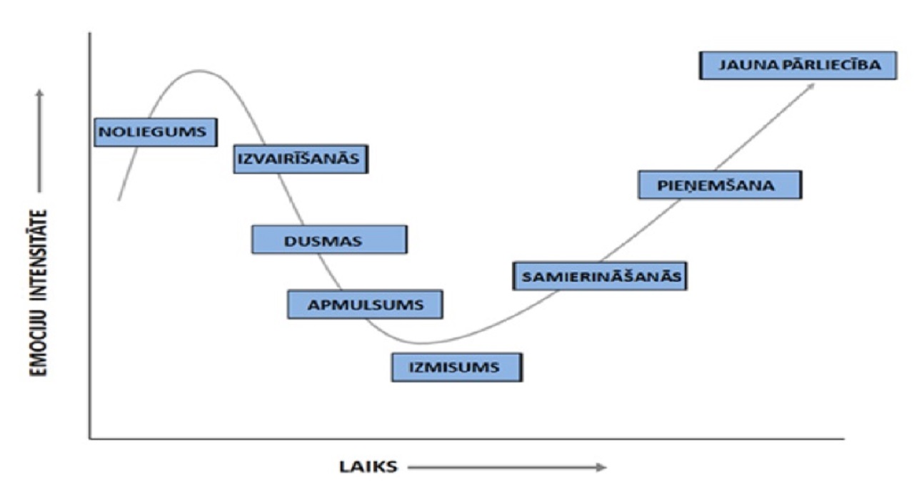 Tā kā katram no mums ir sava iepriekšējā dzīves pieredze, katrs atrodamies kādā citā dzīves punktā, tādēļ arī katram atšķirsies laiks, kāds tiek pavadīts katrā no posmiem. Tomēr savstarpēja pretimnākoša komunikācija un cieņa gan pret sevi, gan apkārtējiem noteikti varētu veicināt veiksmīgāku šo pārejas procesu mums visiem kopā. Es ticu, ka soli pa solītim, liekot lietā savu radošumu un darot to, ko spējam izdarīt, ietekmējot to, ko varam ietekmēt, mums izdosies pieņemt citādo situāciju un iedzīvināt jaunas prasmes un pārliecības gan izaicinošajā attālināto mācību procesā, gan citās dzīves jomās.