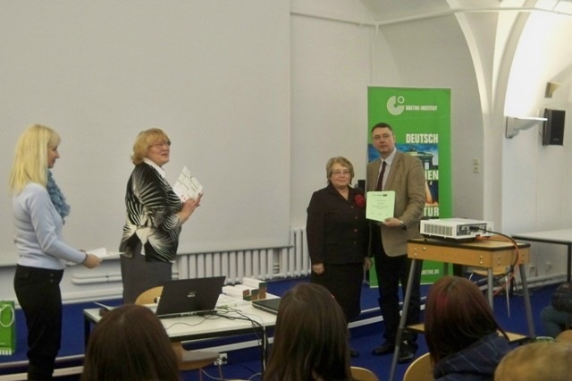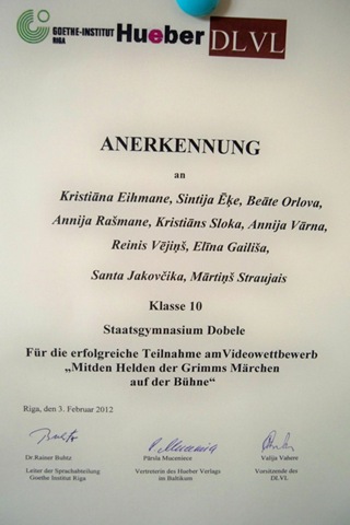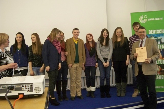 10.klašu vācu grupas skolēni, kas rudenī piedalījās video konkursā "Mit den Helden der Grimms Märchen auf der Bühne", 3.februārī tika uzaicināti viesoties Gētes institūtā, lai tiktos ar pārējo filmiņu autoriem un dalītos iespaidos. Skolēni apskatīja Gētes institūta bibliotēku, tikās ar GI Valodu nodaļas vadītāju Dr Rainer Buhtz, Huber izdevniecības pārstāvi Latvijā P.Mucenieci, vācu valodas skolotāju asociācijas priekšsēdētāju V.Vaheri. Jaunieši saņēma pateicības rakstus un nelielas piemiņas veltes.