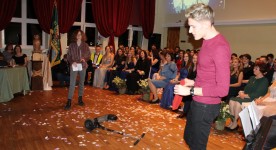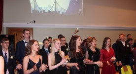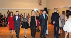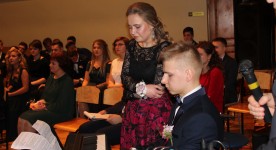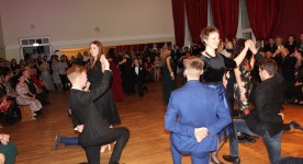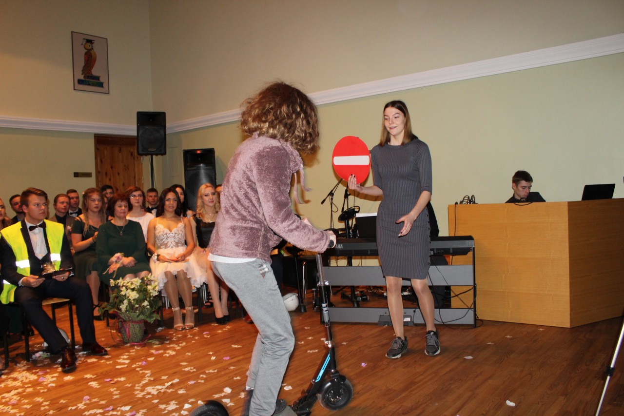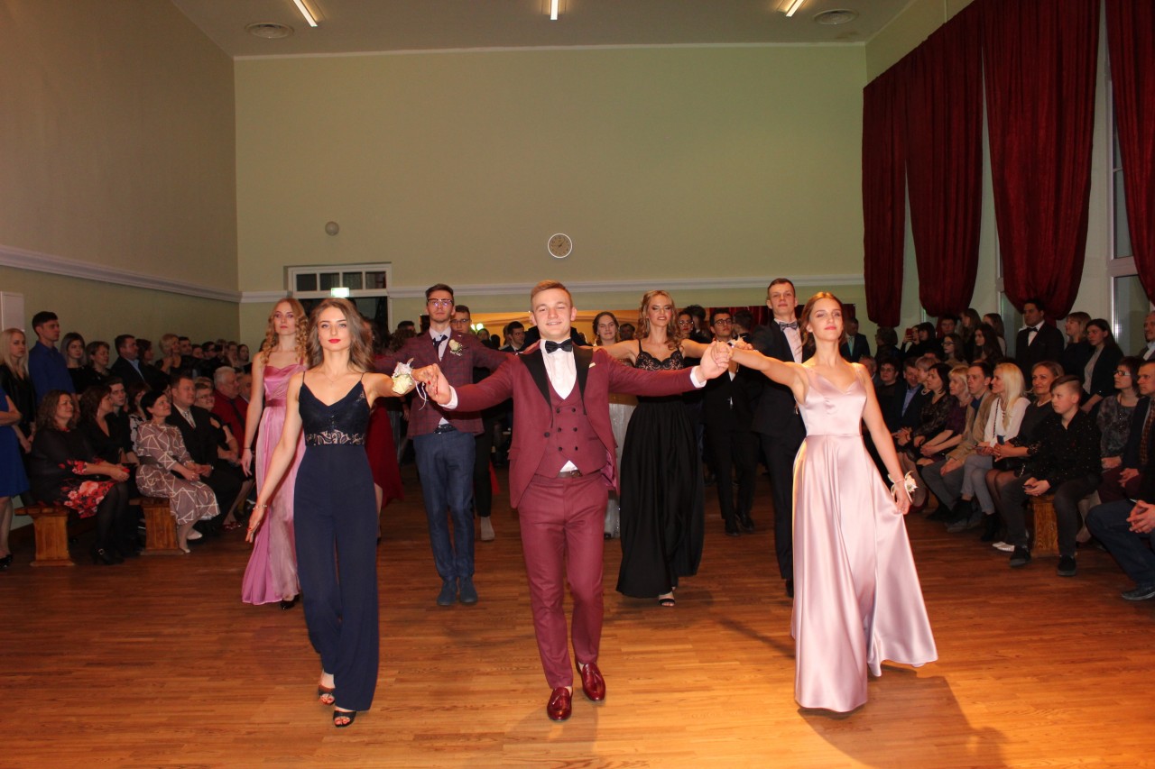 Pēc klases stundas kopā ar vecākiem abiturienti atgriezās svinību zālē, lai parādītu savu iznesību polonēzes soļos.