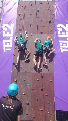 Pārbaudām izveicību uz alpīnisma sienas.